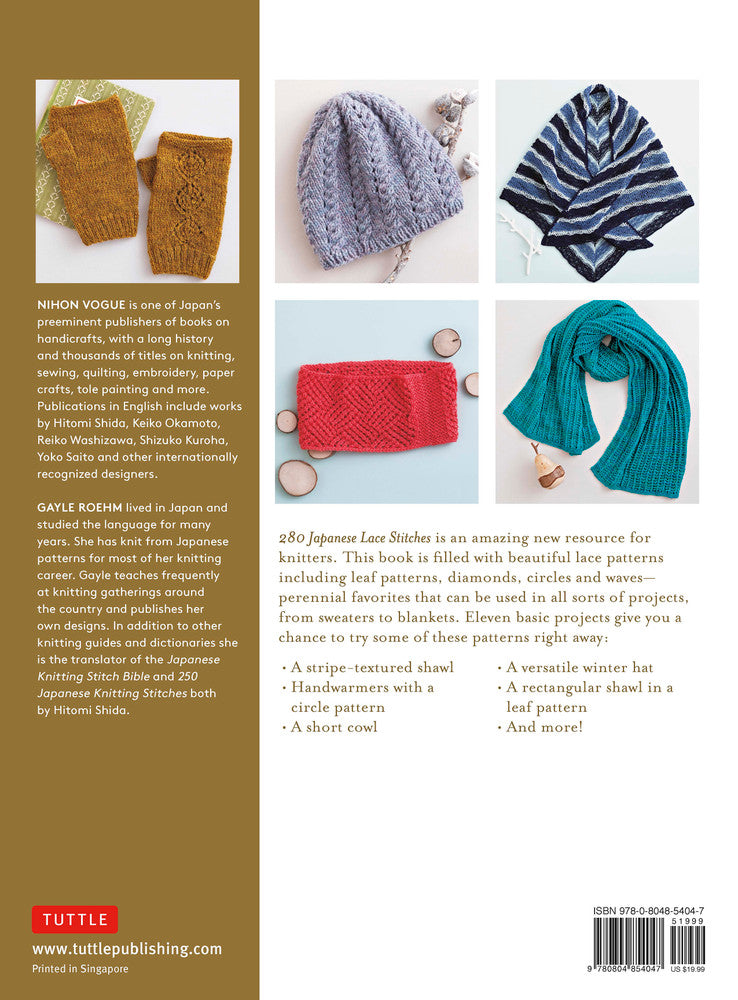 280 Japanese Lace Stitches is a fun and informative resource for experienced knitters. This book is filled with a wonderful variety of beautiful, openwork stitch patterns, including leaf patterns, diamonds, circles and waves—perennial favorites that can be applied to every type of project, from sweaters to blankets. With full-color photos and expert explanations of the symbols and patterns, knitters can expand their knowledge of this elegant and classic style.