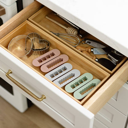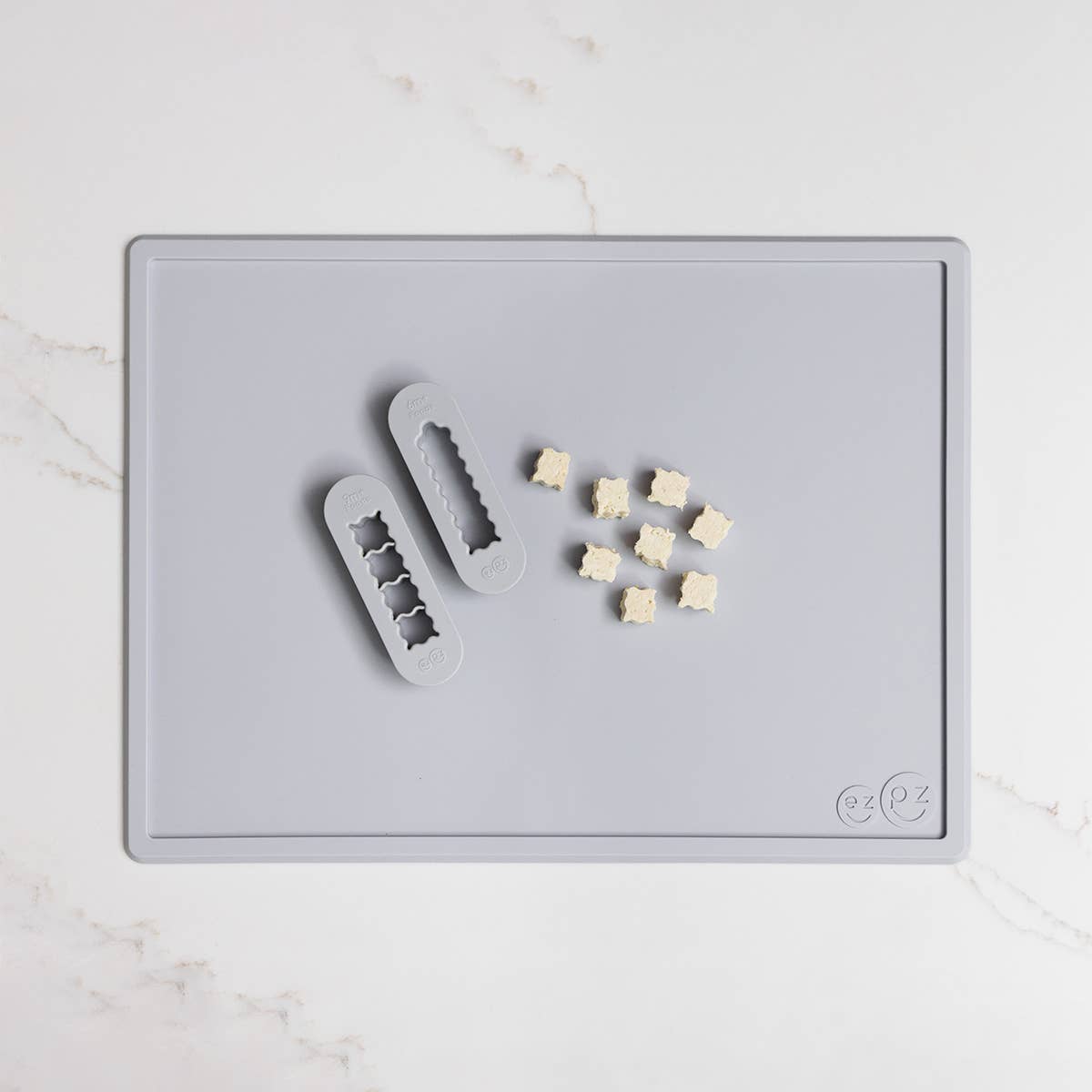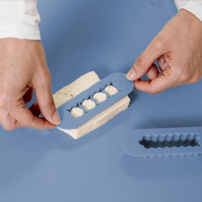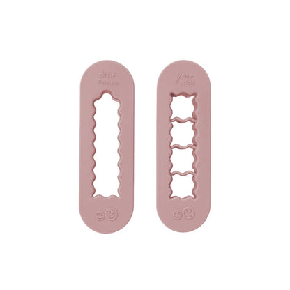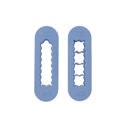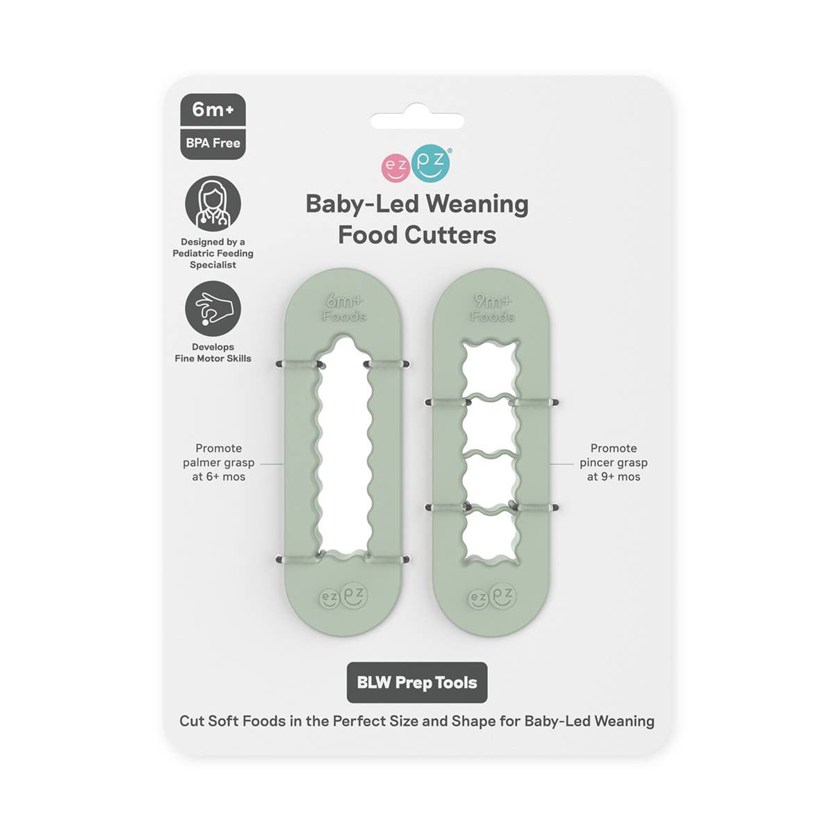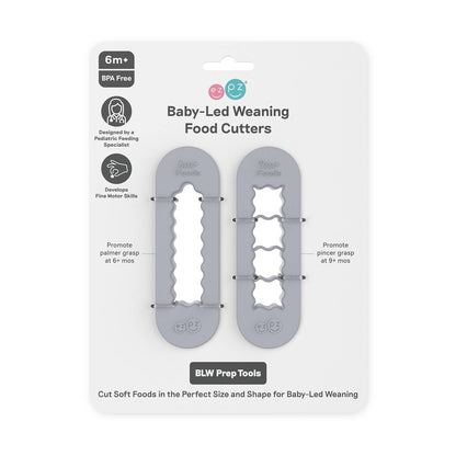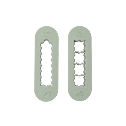 - Set includes [2] unique food cutters - 6m+ food cutter makes finger-length strips (perfect for BLW) - Strips promote the palmar grasp - 9m+ food cutter makes cubes that promote the pincer grasp - Strips + cubes have serrated edges to assist with grasping - Made from nylon - Dishwasher safe