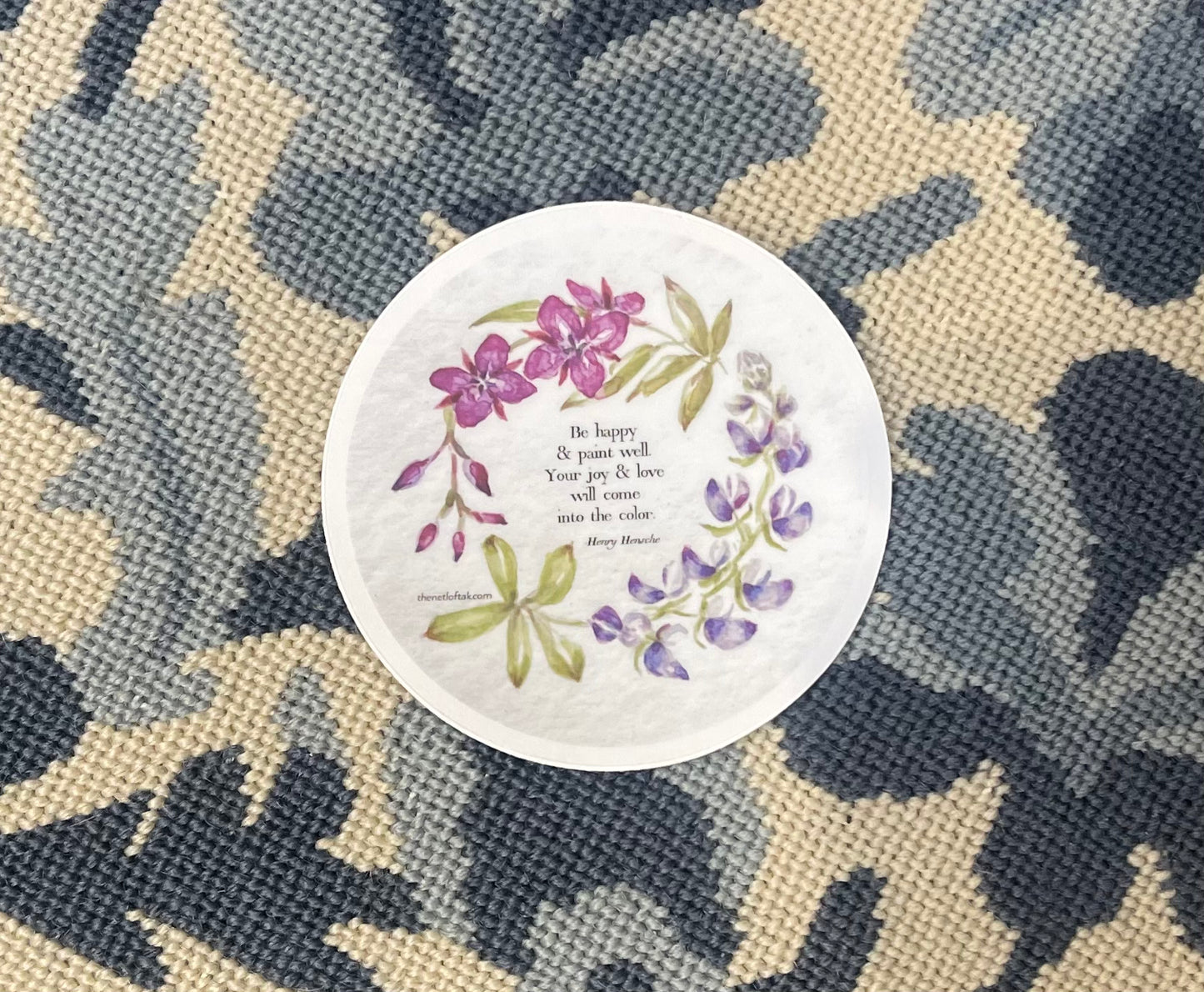 "Be Happy & Paint Well" sticker cites a special quote found in a letter to Dotty's mother from artist Henry Hensche, her plein air oil painting instructor. It is surrounded with a watercolor wildflower wreath of local Cordova flowers lupine and fireweed.