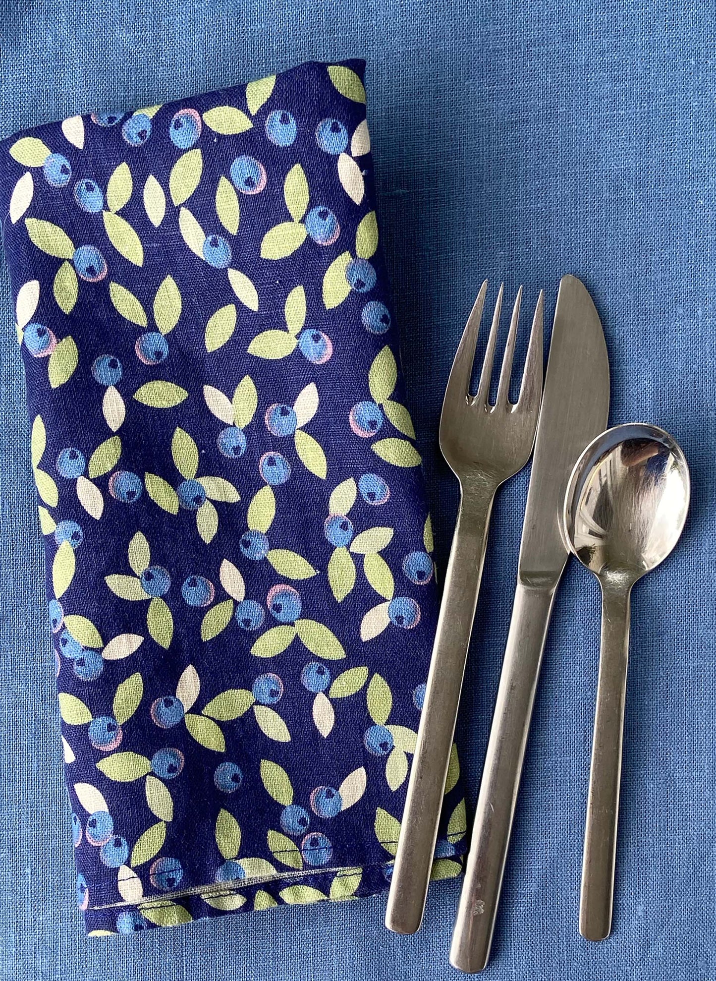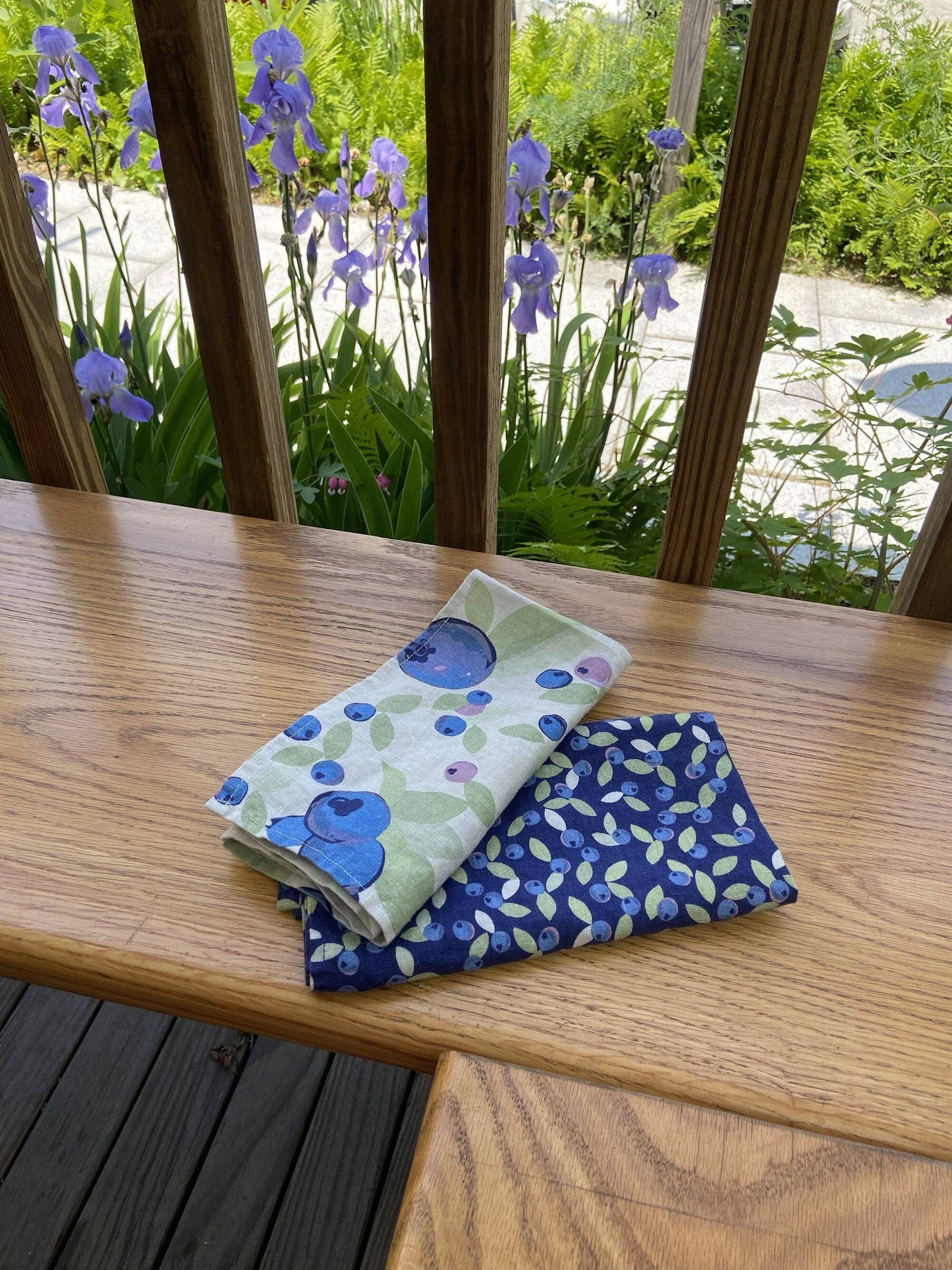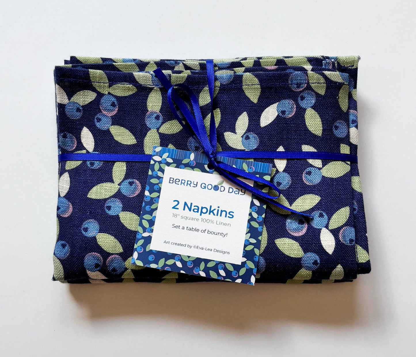 Enjoy the sweetness of summer blueberries all year long! This set of two 100% linen napkins covered in a field of wild blueberries, will bring back all the memories of summer. Both useful and unique, the sturdy, lint-free fabric softens with each wash but the colors stay rich and vibrant. Tuck one into your picnic basket or add some cheery functional art to your home, cottage, or cabin decor. Something useful for theme party, holiday, or a housewarming gift. Nothing brings more joy than the ping of the first blueberry as it drops into the pail.