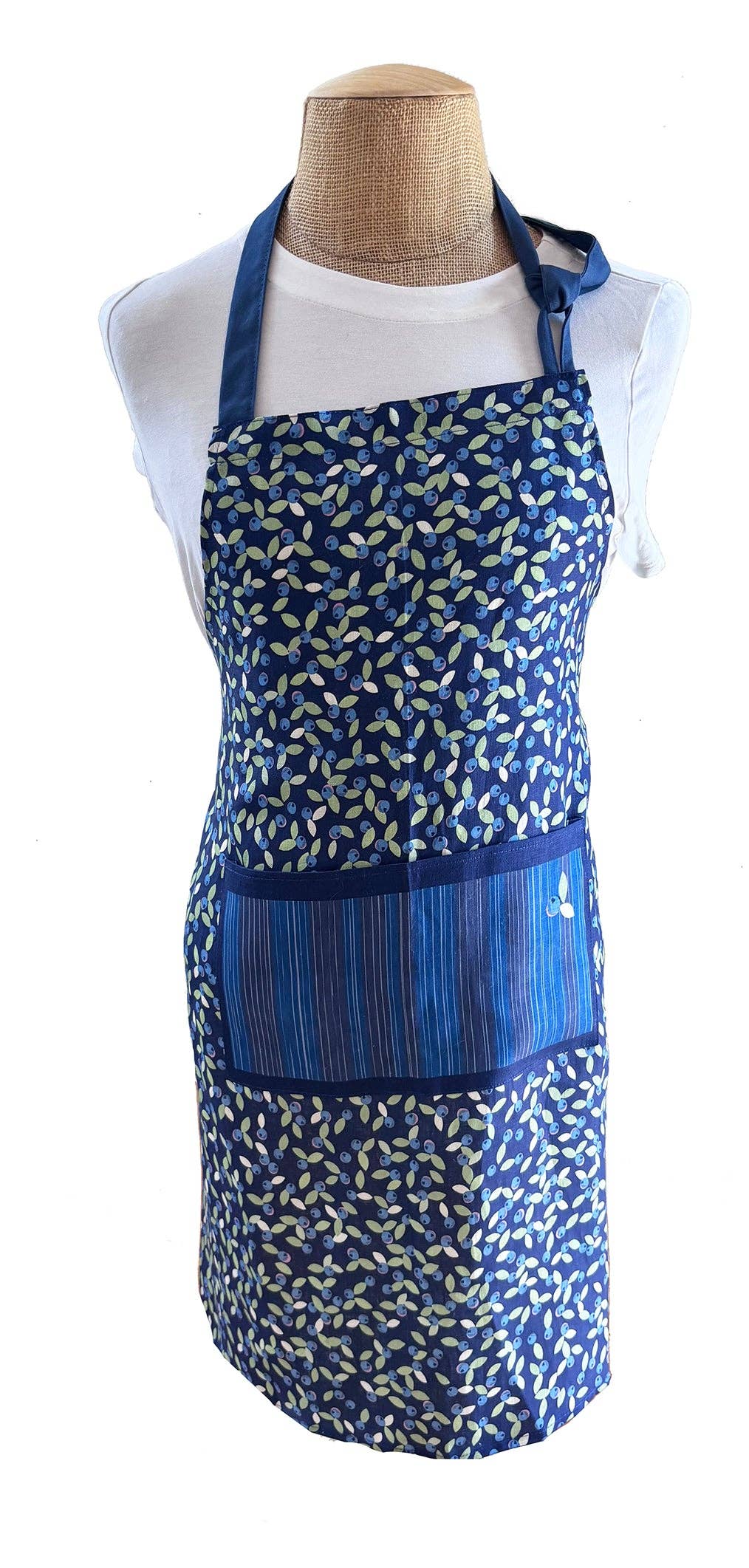Adult: Measures 26”wide x 30” long” • 100% Linen, 200gsm with cotton trim ties • Soft but sturdy and lint-free fabric • With an attached loop for easy hanging• Hypoallergenic• Quality linen can endure for years• Designer fabric • Rich long-lasting color • Linen fabric has a natural nubbiness. Some small print abnormalities may appear. • Coordinates with Berry Good Day tea towels, oven mitts, potholders, and napkins.