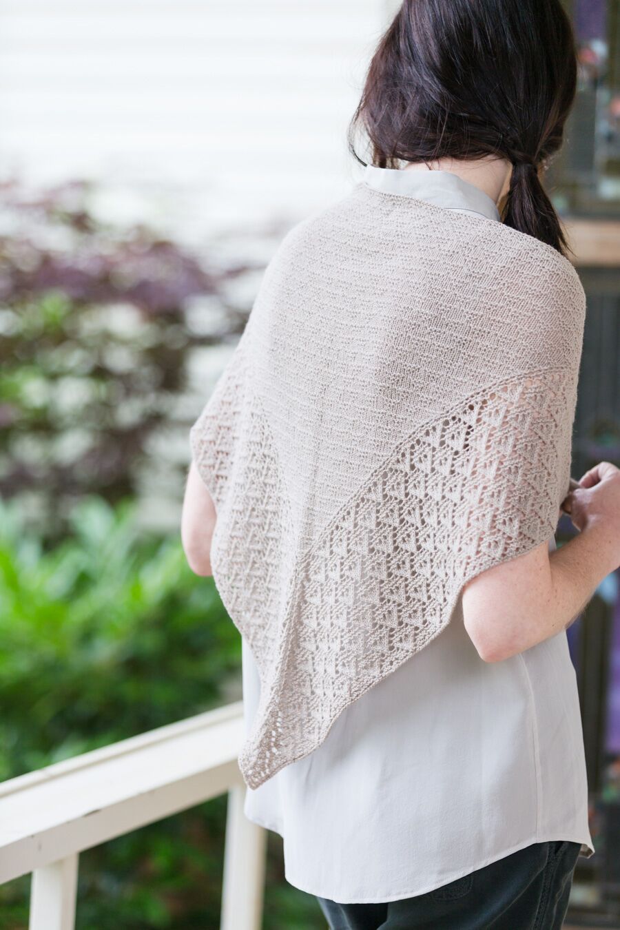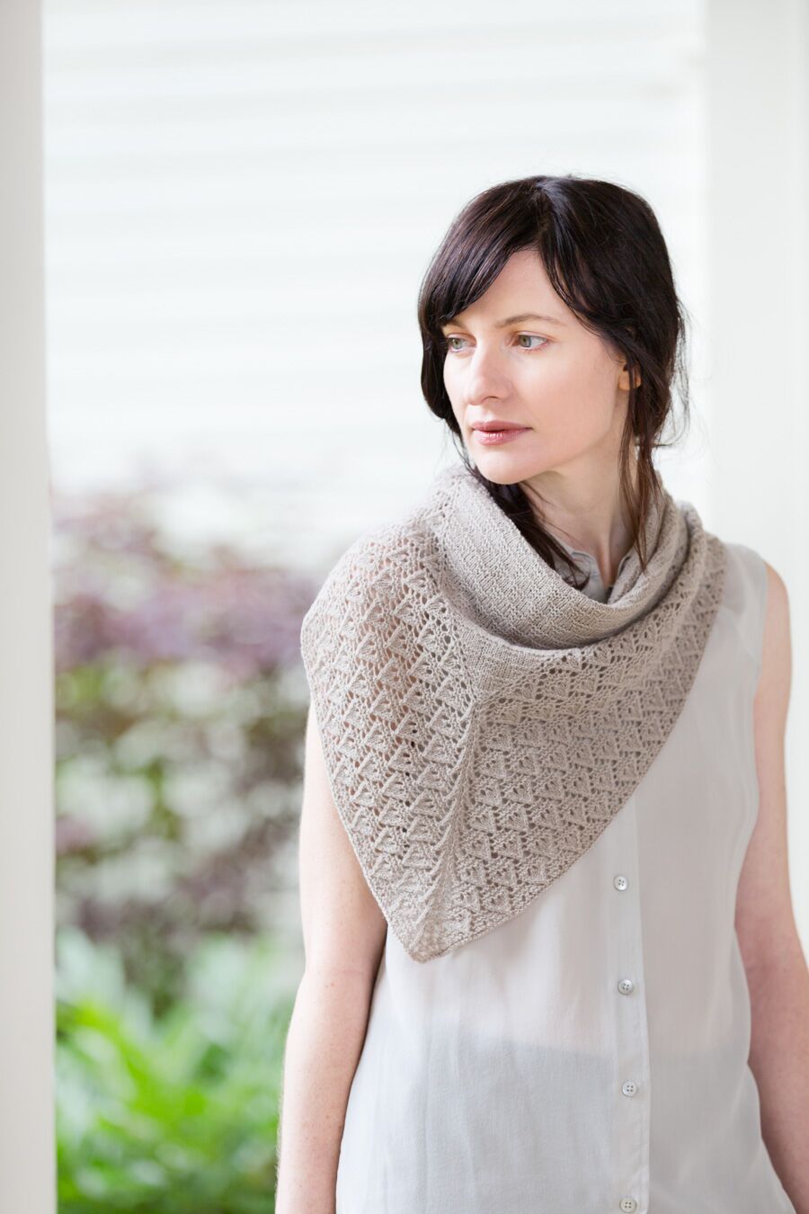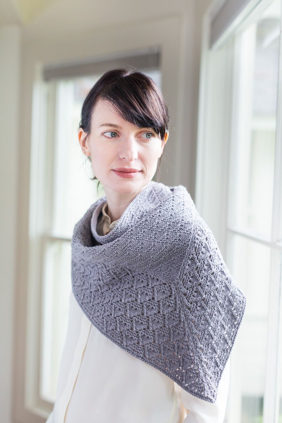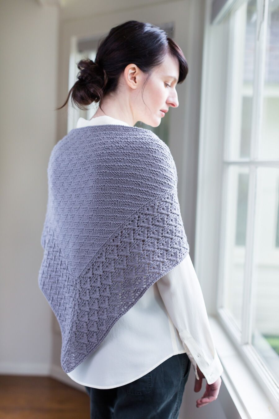 This distinctive shawl, printed all over with triangles of garter stitch, can be worked in two weights. Knit a breezy complement to summer dresses in Vale or a slightly larger triangle with comforting weight and warmth in Arbor. The arrowhead lace edging combines garter stitch and eyelets to achieve a flintknapped texture. The pattern teaches the Icelandic Bind Off technique to yield an elastic edge that partners effectively with garter stitch.