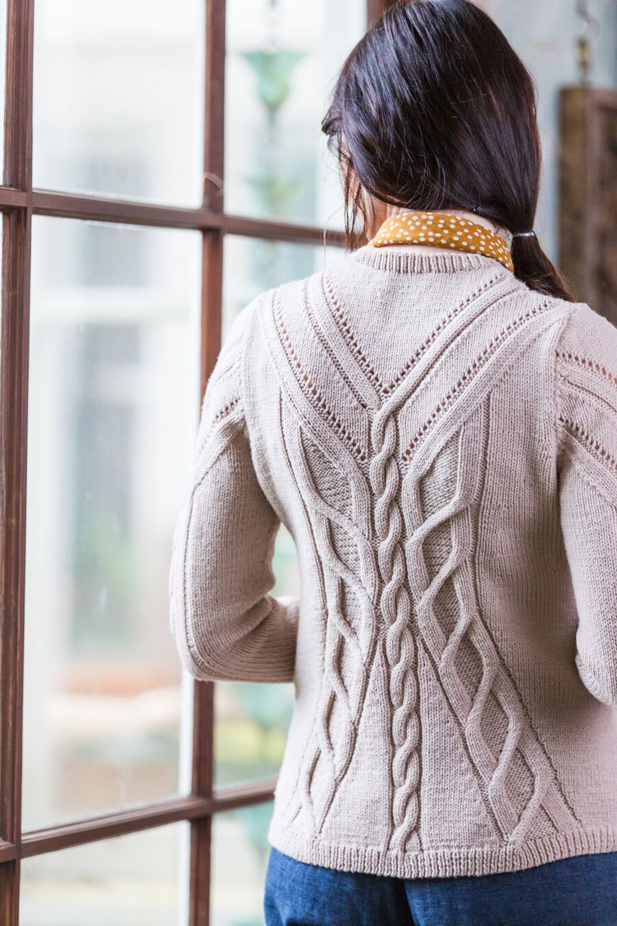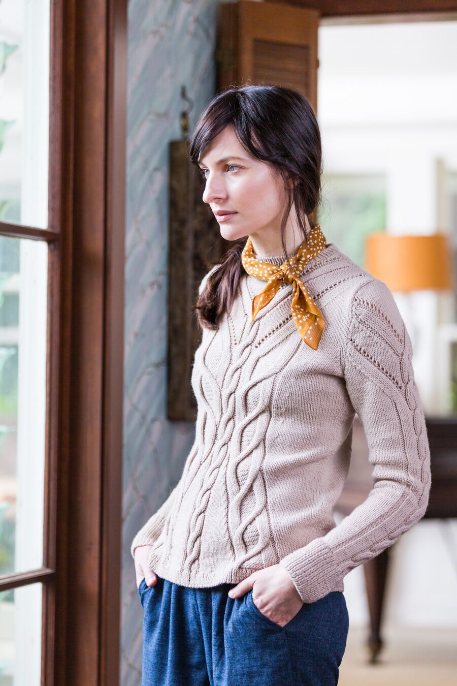 Trim sophistication for sightseeing or touring the vineyards. This sleekly fitted pullover in Arbor features bold parallelogram cables filled with reverse stockinette that lean into a central supporting cable, then branch into a flattering V across the upper torso. The set-in sleeve caps echo the motif, and delicate single-rib edges add to the feminine effect. Shaping at the waist and on princess seam lines creates a slim fit that pairs well with skirts and boots. Fieldstone is worked in pieces and sewn together, with the dainty crewneck band picked up to knit in the round after assembly.