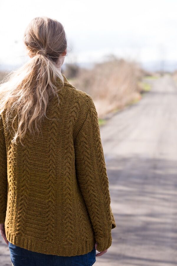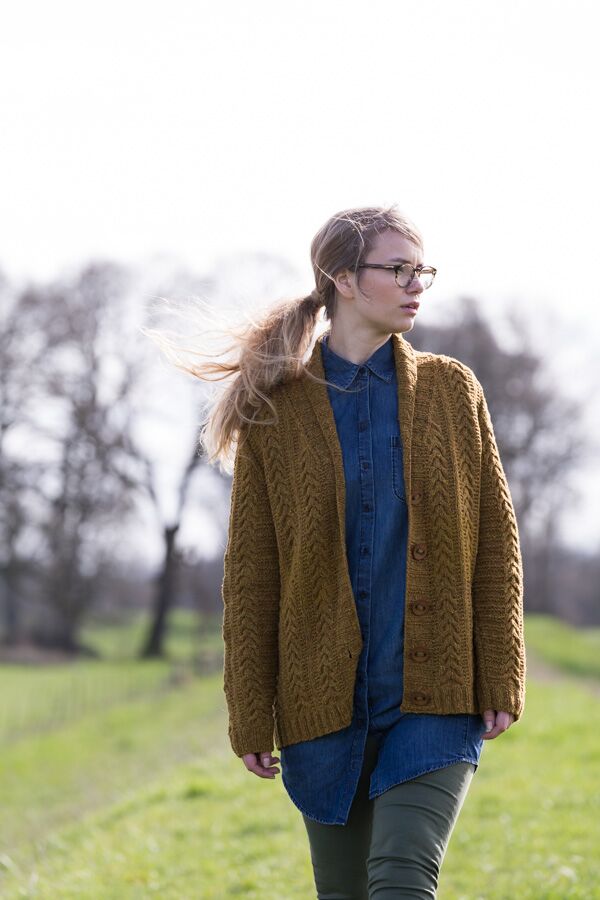 Gull stitch cables, welts, and ladders stamp this handsome unisex cardigan with bold textures. Set-in sleeves and strong vertical lines make for a flattering fit despite the oversized styling. The body is knit flat in a single piece; the sleeves are also knit flat and sewn in. Stitches for the button bands and collar are picked up after seaming and shaped with short rows to create a cozy shawl collar in double rib. Migration is perfect as outerwear in mild seasons or for warming up indoors when the house is chilly.