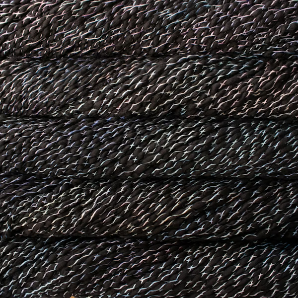 "On-Black" collection. A truly unique yarn! We start with a bulky thick-and-thin single made of our delightfully soft superwash merino wool, and then we criss-cross it with a binder thread (either black or white.) Then the yarn is dyed one of our signature kettle-dyed colorways, and: poof! Something unlike any yarn we've made before, inspired by a particular style of hand-spun yarn. Caracol knits up into a cozy, fluffy fabric with a ton of texture and visual interest. Simple stitch patterns really let it sing!