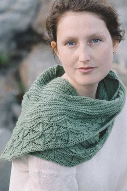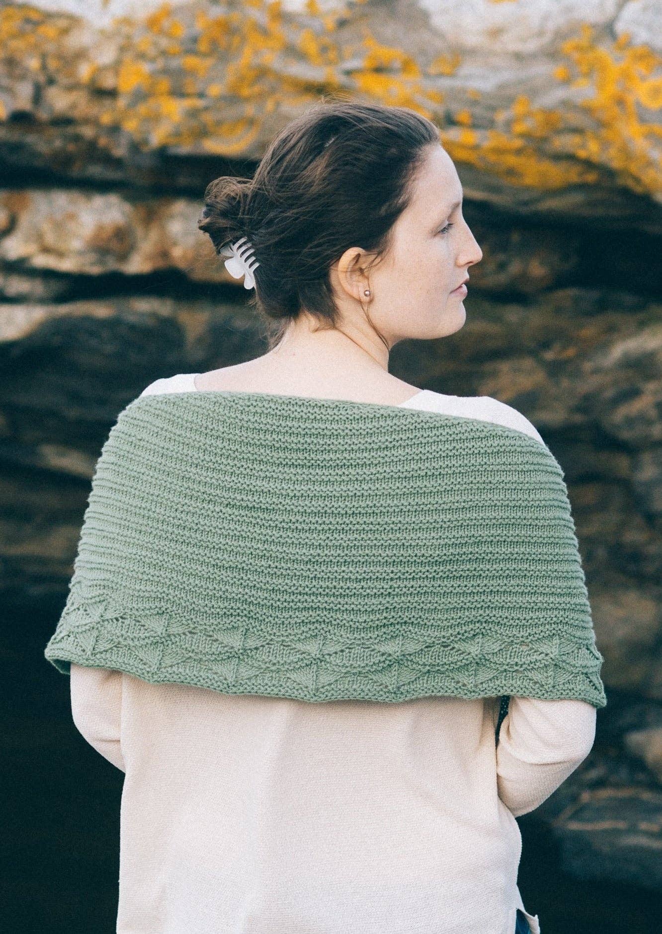Finished Measurements 64" [162.5 cm] wingspan and 12" [30.5 cm] deep at center. Materials Chickadee by Quince & Co (100% American wool; 181yd [166m]/50g) 3 skeins Lichen 126. Gauge 20 sts and 38 rows = 4" [10 cm] in garter ridge pattern, after blocking.
