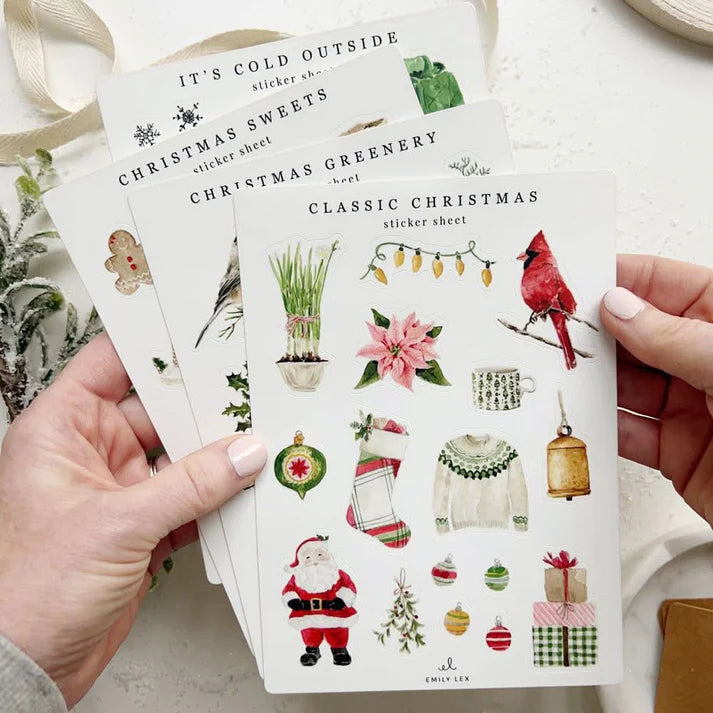 - 4 sticker sheets. One of each style: Classic Christmas, Christmas Sweets, Christmas Greenery, It's Cold Outside.