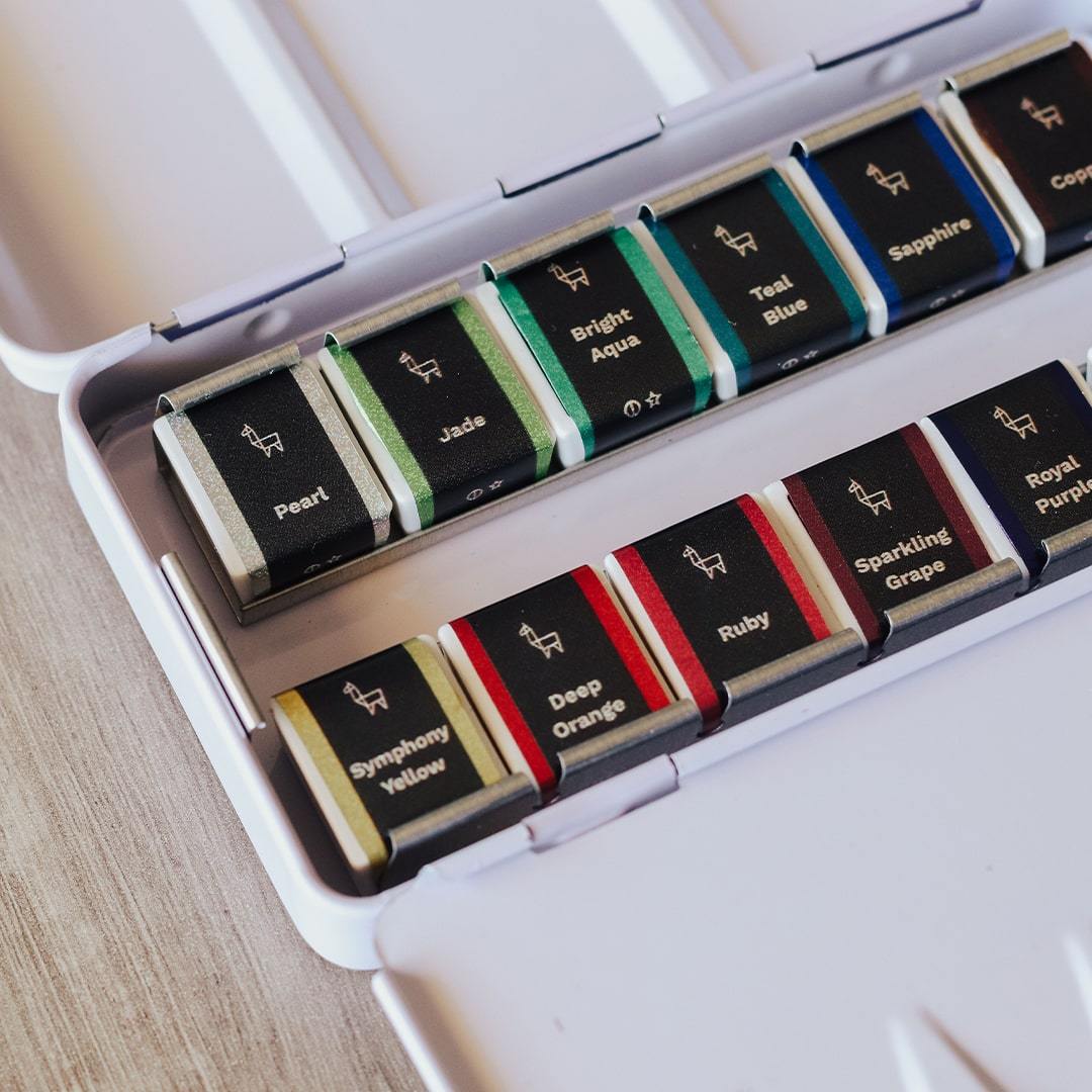 Hand-picked vegan-friendly metallic glitter watercolours in a set of 12 half-pans. Premium Student Grade.