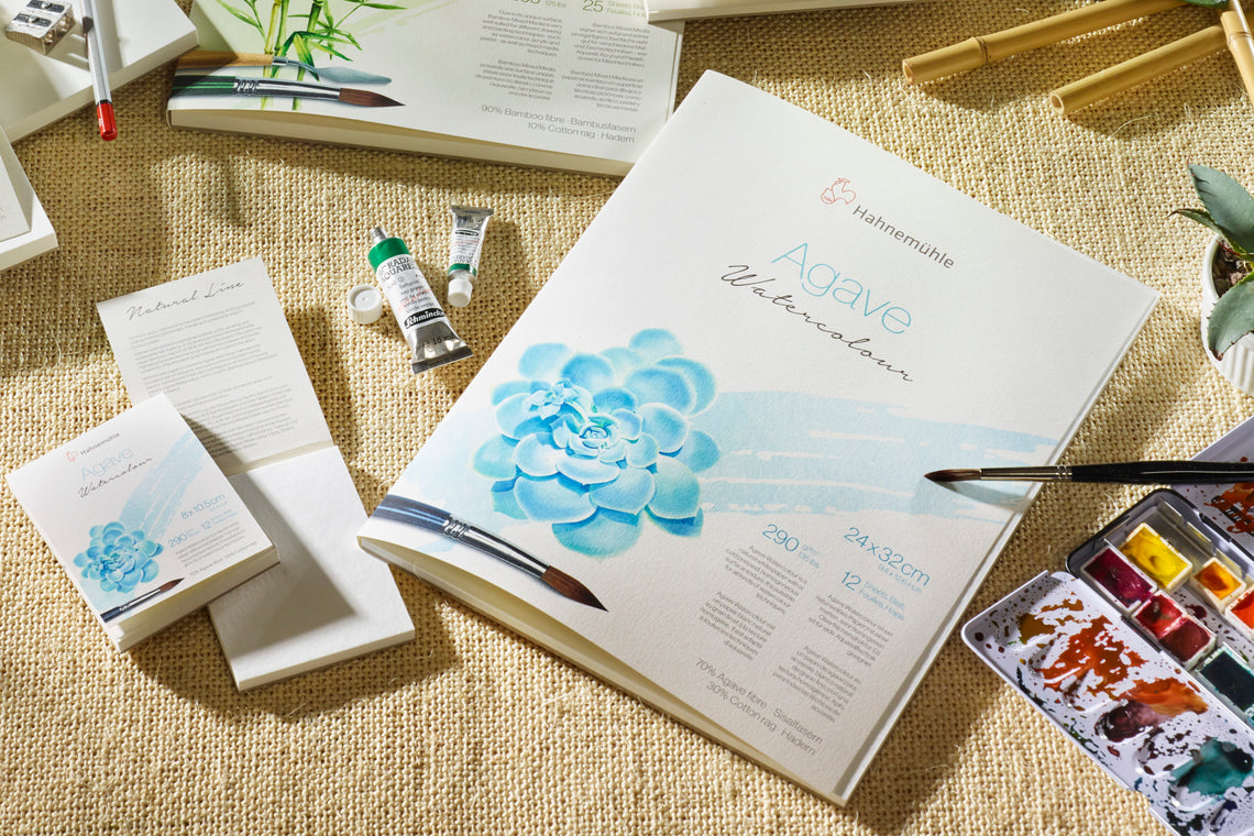Agave Watercolour is acid-free, non-aging and vegan. By using sisal, a fast-growing and resource-saving raw material, Agave Watercolour is the ideal painting surface for environmentally conscious artists. All Agave Watercolour blocks are glued on 4 sides. Individual sheets can be easily removed with Hahnemühle‘s bamboo folder.