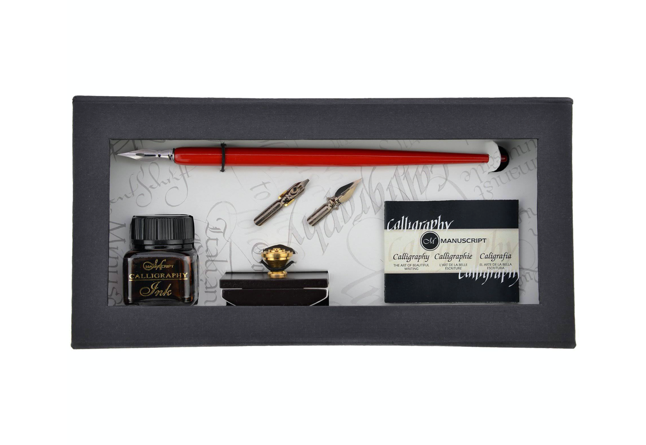 This 9.5x4.5x1.75 inch package contains one pen holder, one roller blotter, one 300 ballpoint nib, one 41 fine crown nib, one 18ml bottle of sepia ink and one calligraphy introductory booklet.