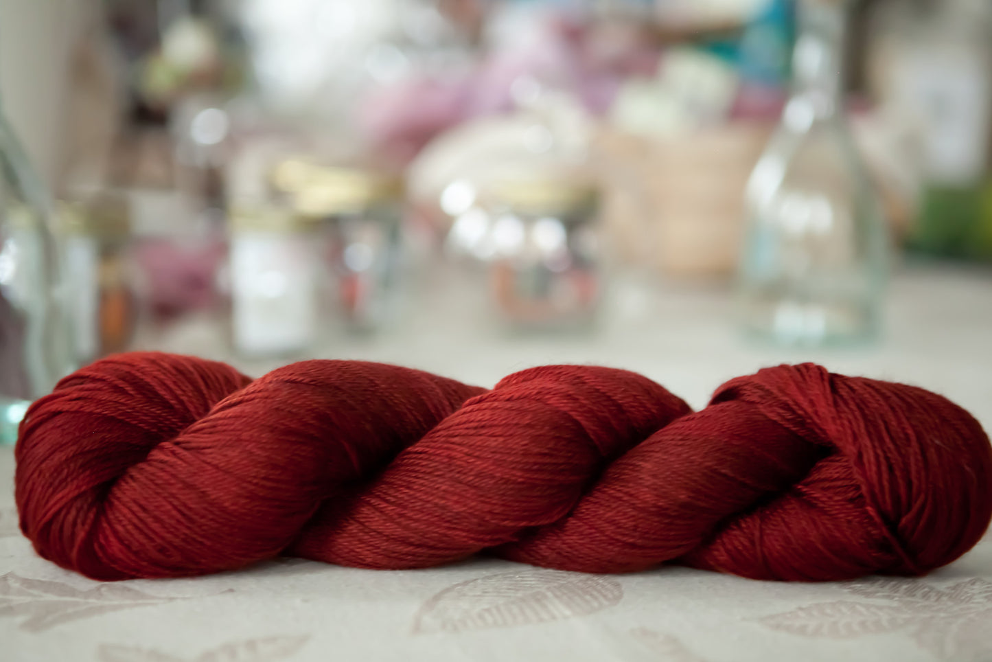 A lustrous blend of merino, bamboo, and nylon. Colorways dyed on this fingering weight yarn have a heathered, ethereal appearance.