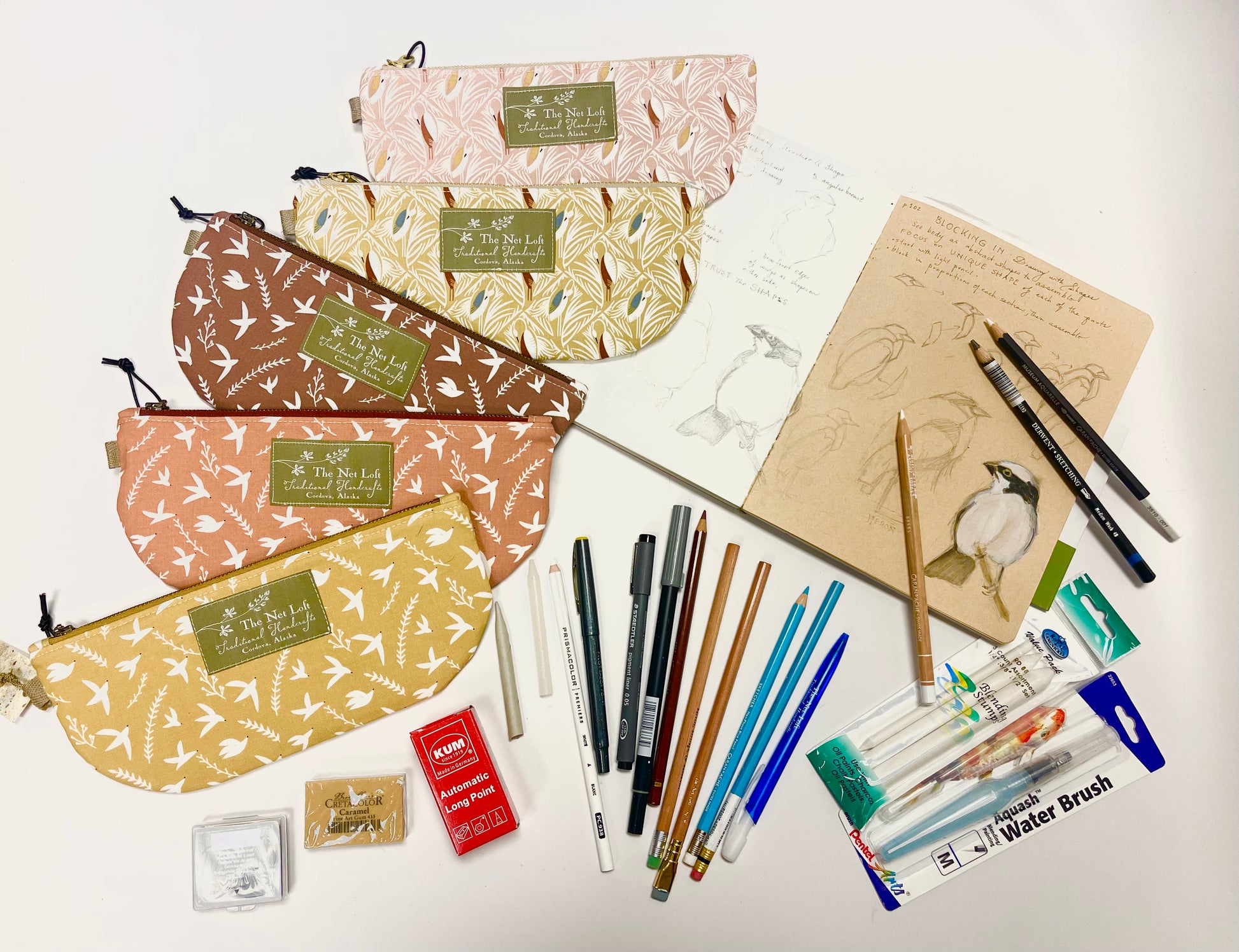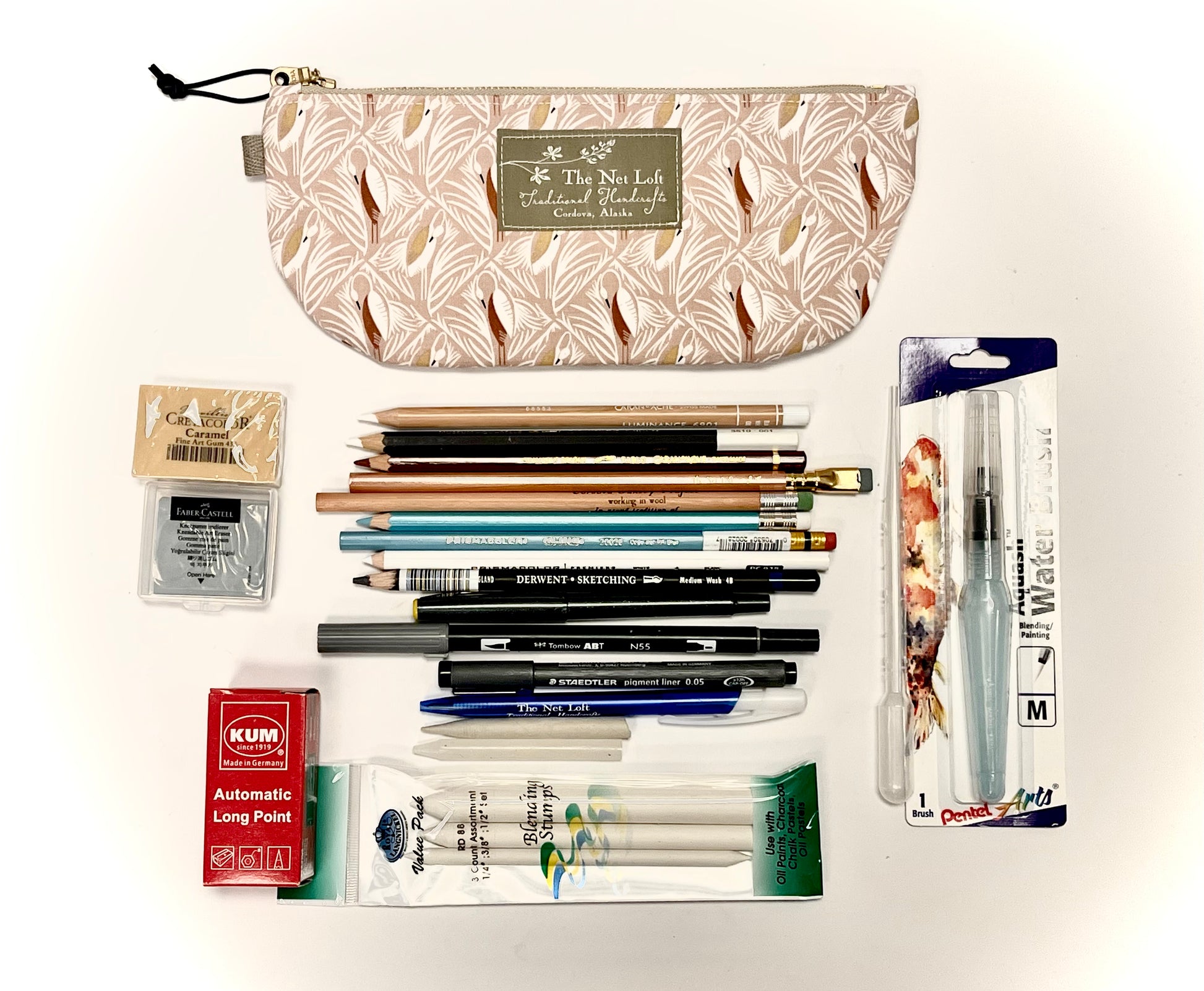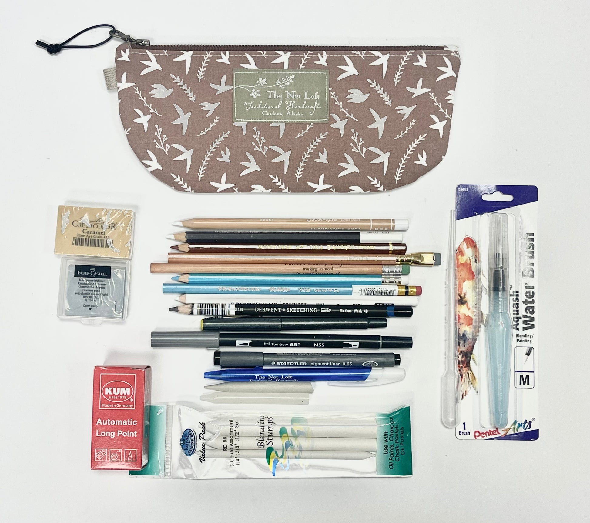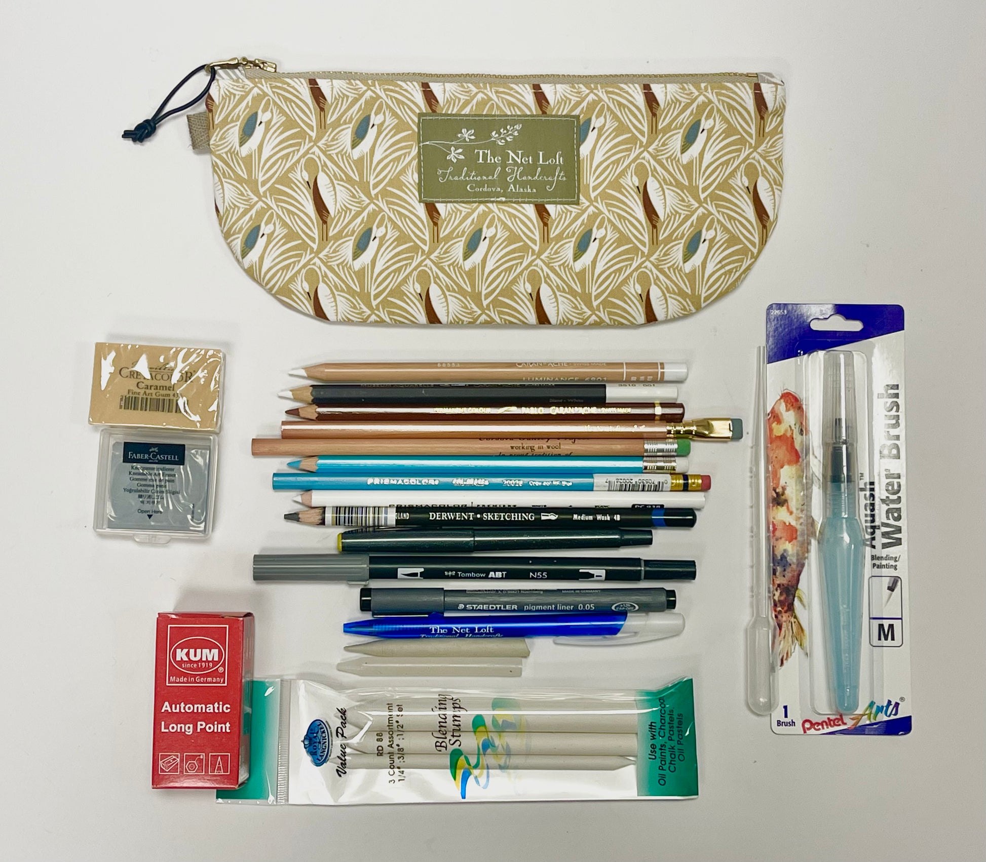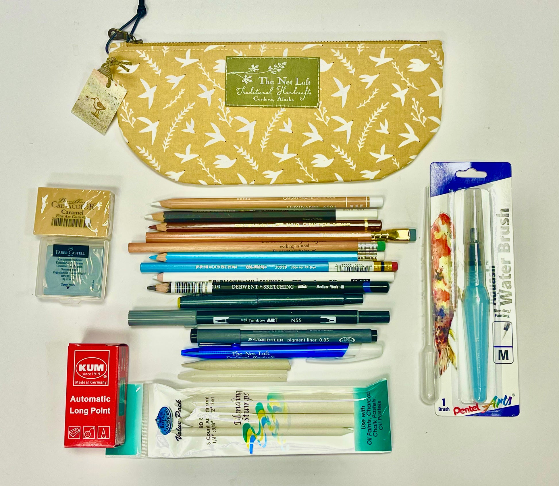 Net Loft Laws Drawing Materials Kit includes a collection of pens, pencils & supplies stored in a limited edition locally crafted KSea.Otter Pencil Case. List includes: Caran D'Ache Museum and Luminance Whites, Caran D'Ache Pablo Brown, Caran D'ache Non-Photo Blue, Prismacolor Colorerase Blue, Prismacolor White, Blackwing Natural, Derwent 4B Graphite Water-soluble pencil, Pilot water soluble pen, Tombow brush marker, pigment liner, ball point pen, water-brush, wax crayon, kneaded and caramel erasers, long point pencil sharpener, pipette, blending stumps. $85 value, special kit price: $62.95. This set is perfect companion for any of the Laws Guides.