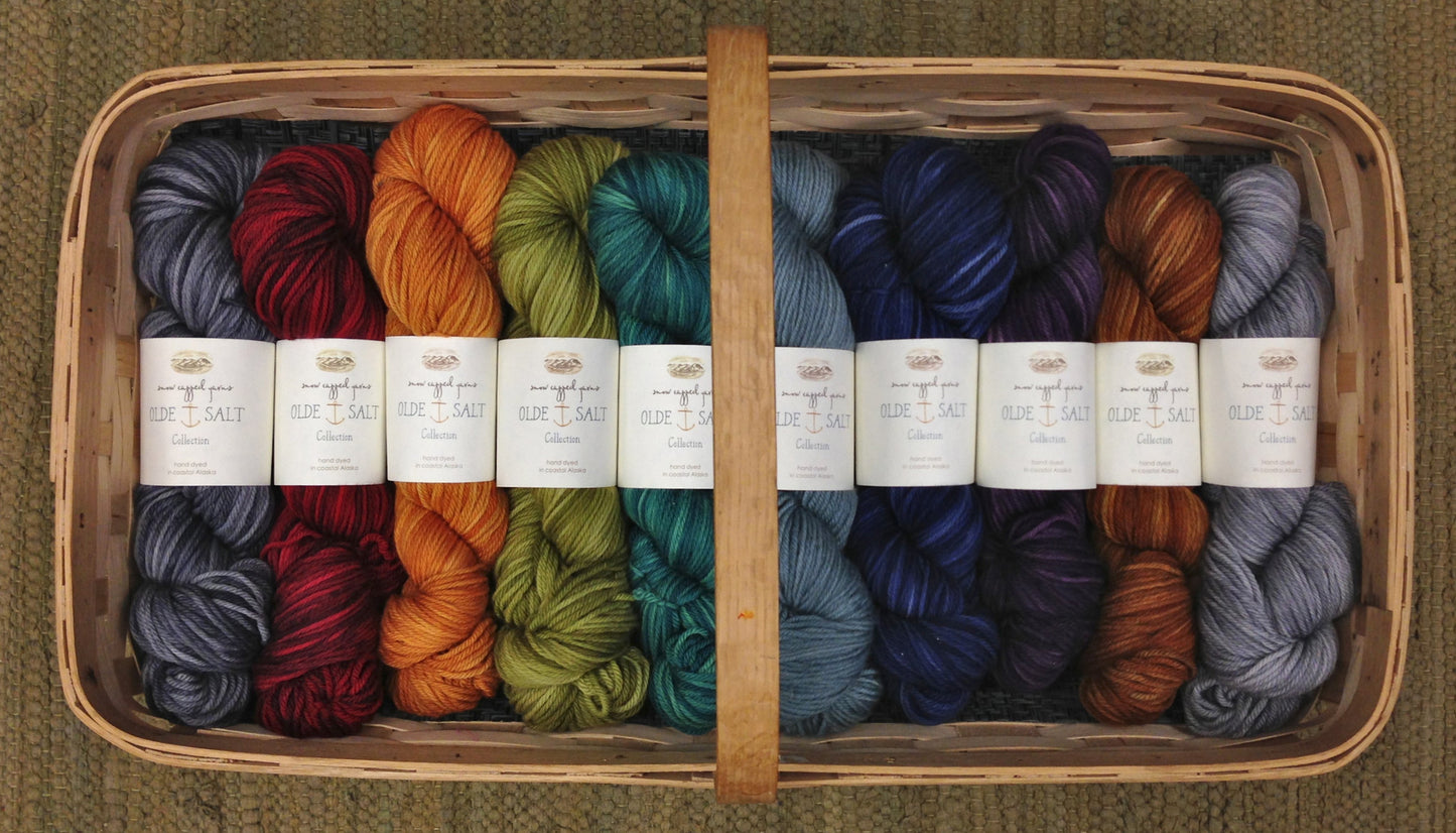 The Olde Salt Collection is a set of hand dyed yarns from Snow Capped Yarns, our exclusive yarns hand dyed by Shelly Kocan in Cordova, Alaska. This set of yarns features a palette of tonal marine inspired color ways on a variety of bases, which work well for textures, cables, lace and color work.