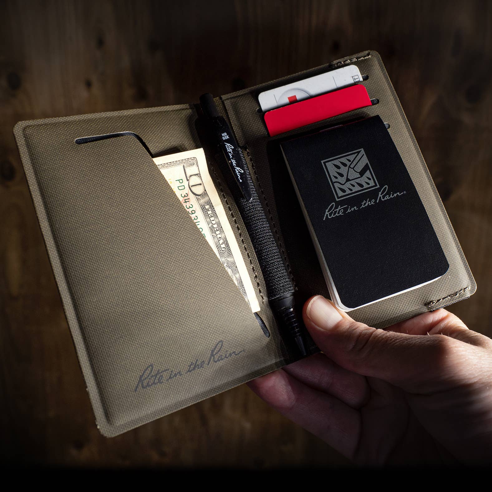 This durable Rite in the Rain EDC Monsoon Wallet is built to accommodate a writing instrument and our most compact notebooks. Tough, waterproof TPU material will survive any pocket or pack for years. Store your mini notebook on the outside in the exterior pocket for instant access. Use the elastic wallet & notebook closure to secure your notebook and hold your wallet shut tight when not in use. Designed to keep you equipped with your daily essentials: room for 9 cards or three On-The-Go Notebooks, one Mini-Staple Notebook, and an All-Weather Pen.