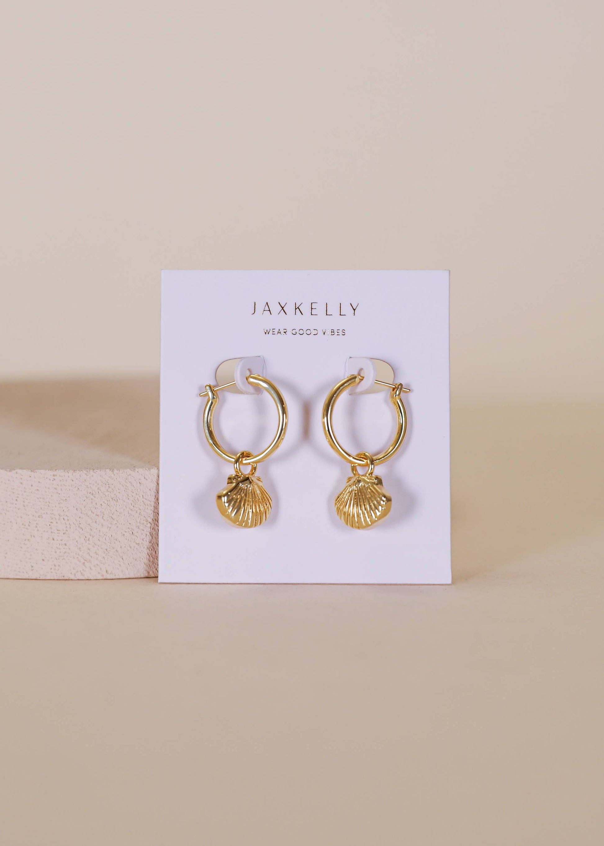 Embrace that coastal vibe with these seashell hoops. With etched detailing, these are lightweight, and perfect in first or second piercings. Tarnish Free - Long lasting protective coating safeguarding your jewelry from sweat, water, and more. Sterling Silver Posts – 18K gold plating over brass Hypoallergenic – Lead Free The studs are 6mm x 7 mm
