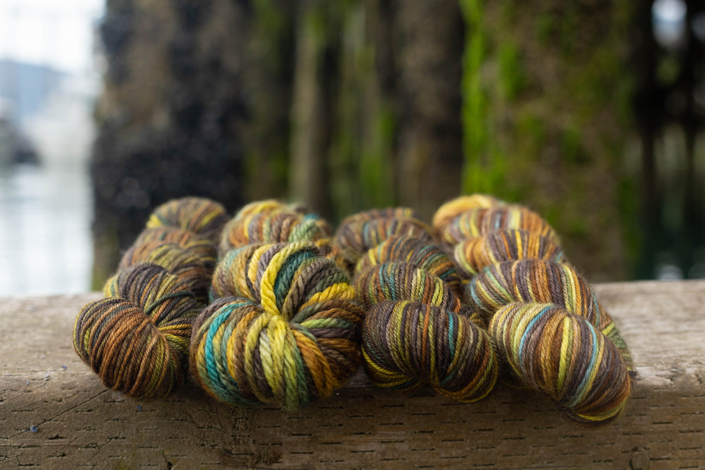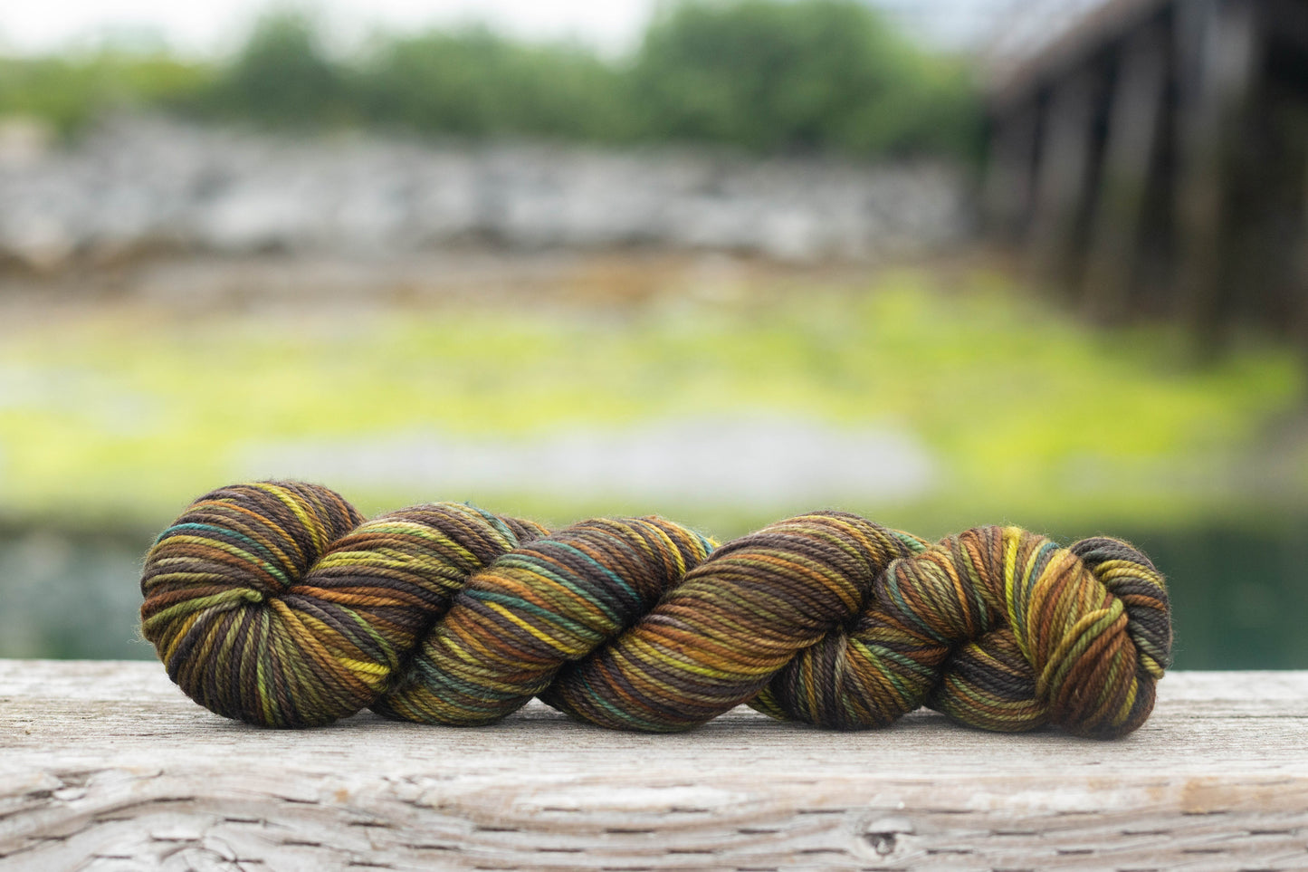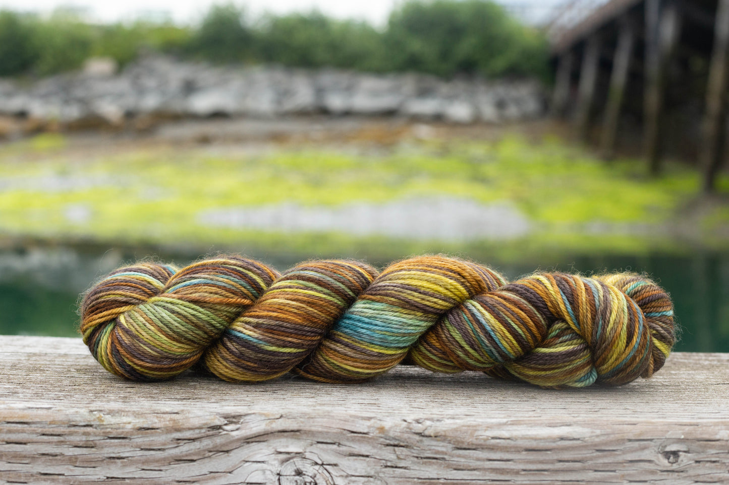 The Cordova Colorway Seaweed is inspired by a photograph by Colleen Borodkin of a low tide along the road to Orca Cannery exposing the colors of various seaweeds revealed by the extreme tides. The rich bronzes, olives, and golds are just some of the colors that compose this Three Irish Girls custom colorway.