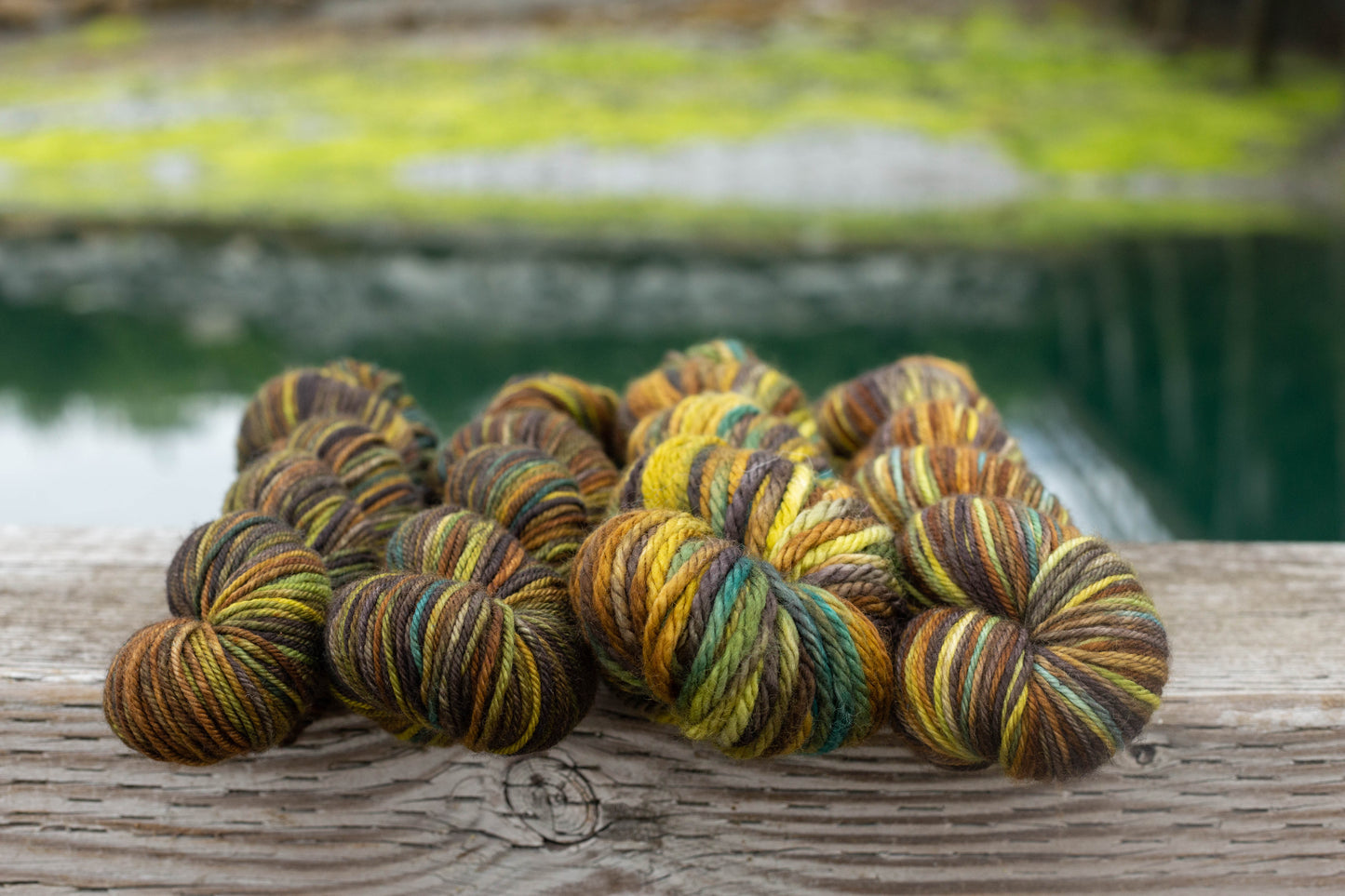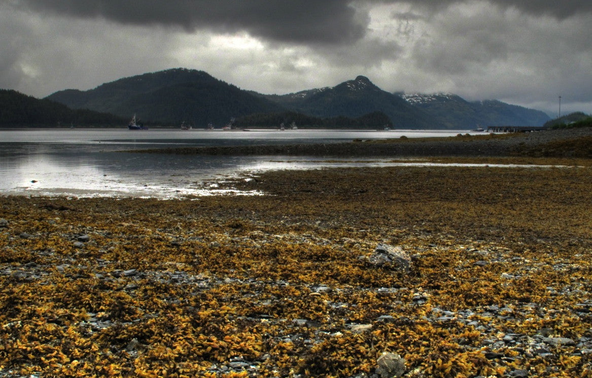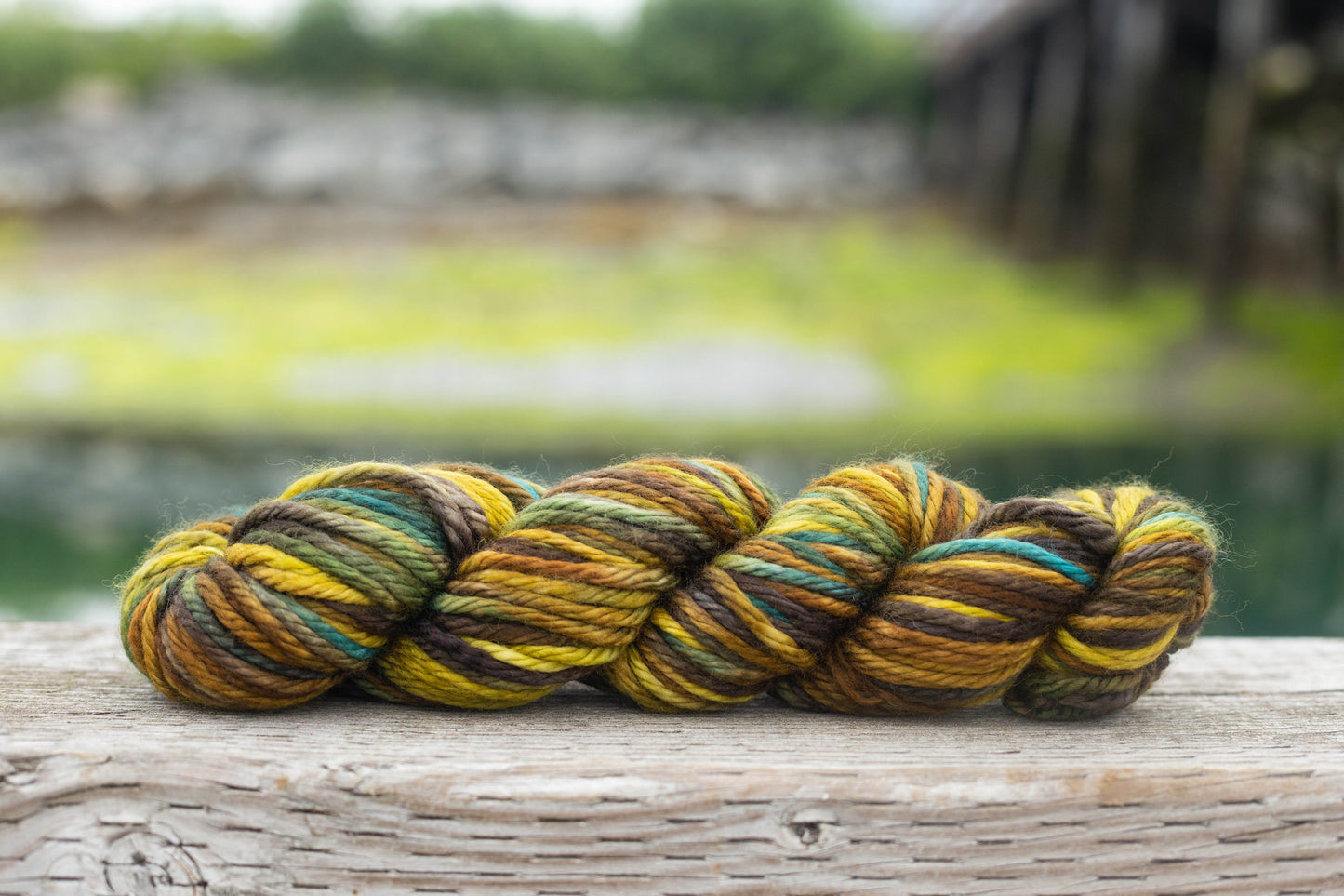 The Cordova Colorway Seaweed is inspired by a photograph by Colleen Borodkin of a low tide along the road to Orca Cannery exposing the colors of various seaweeds revealed by the extreme tides. The rich bronzes, olives, and golds are just some of the colors that compose this Three Irish Girls custom colorway.