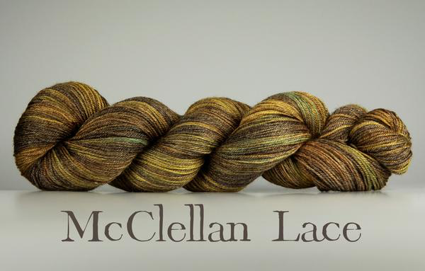 McCellan Lace is a glowing mixture of merino and bamboo, with a smooth construction and beautiful stitch definition and softness. It's a heavier weight lace that can be used for socks, too