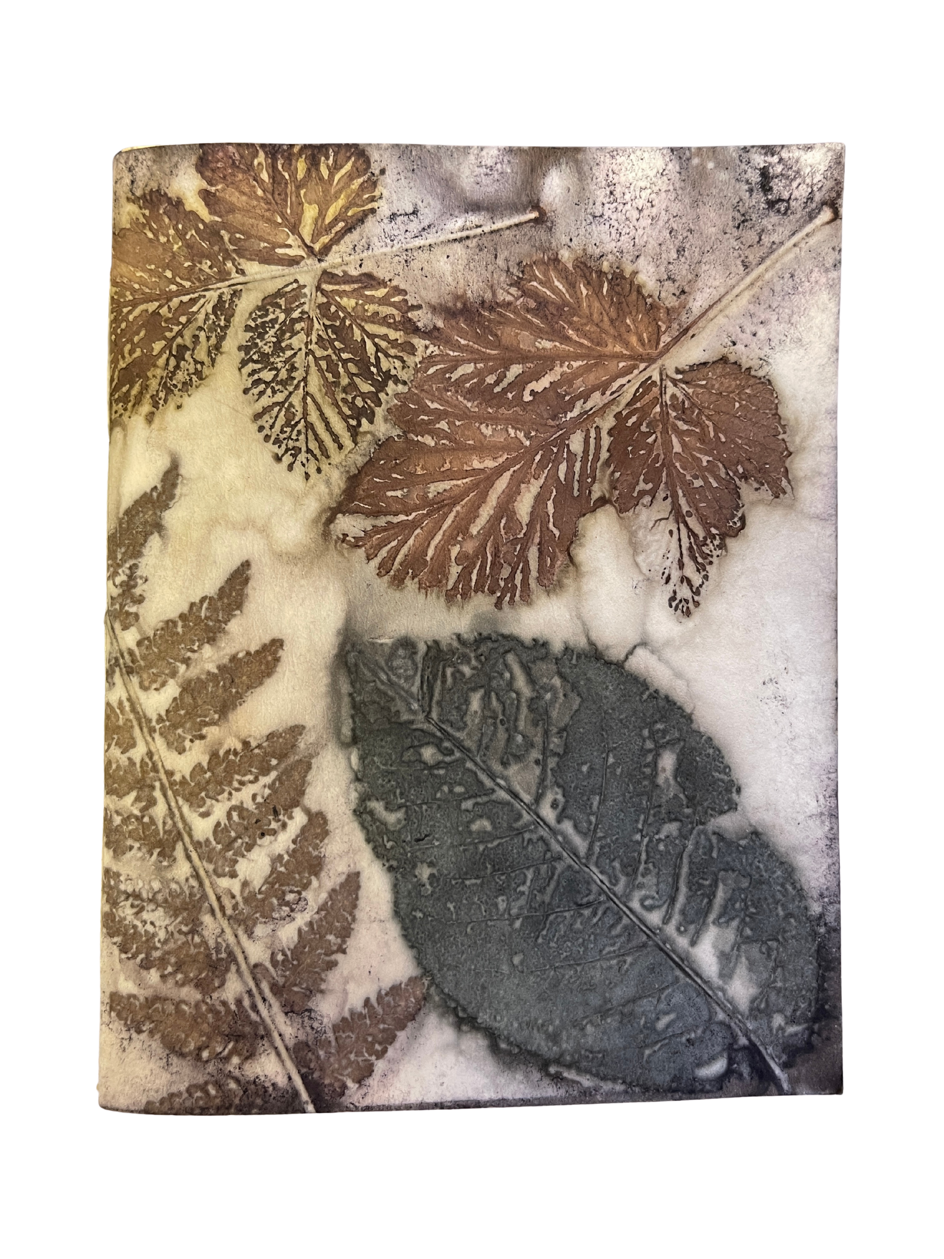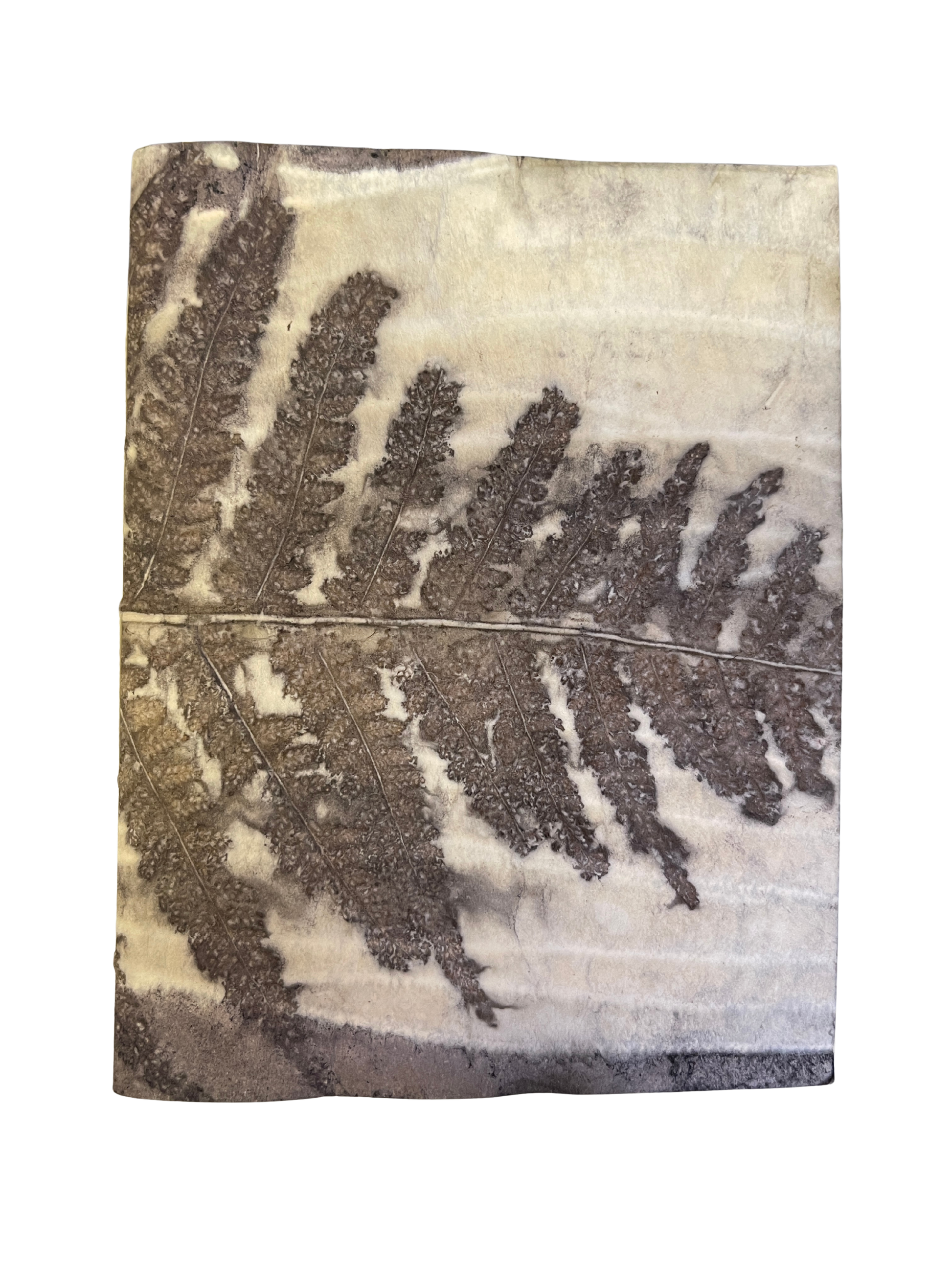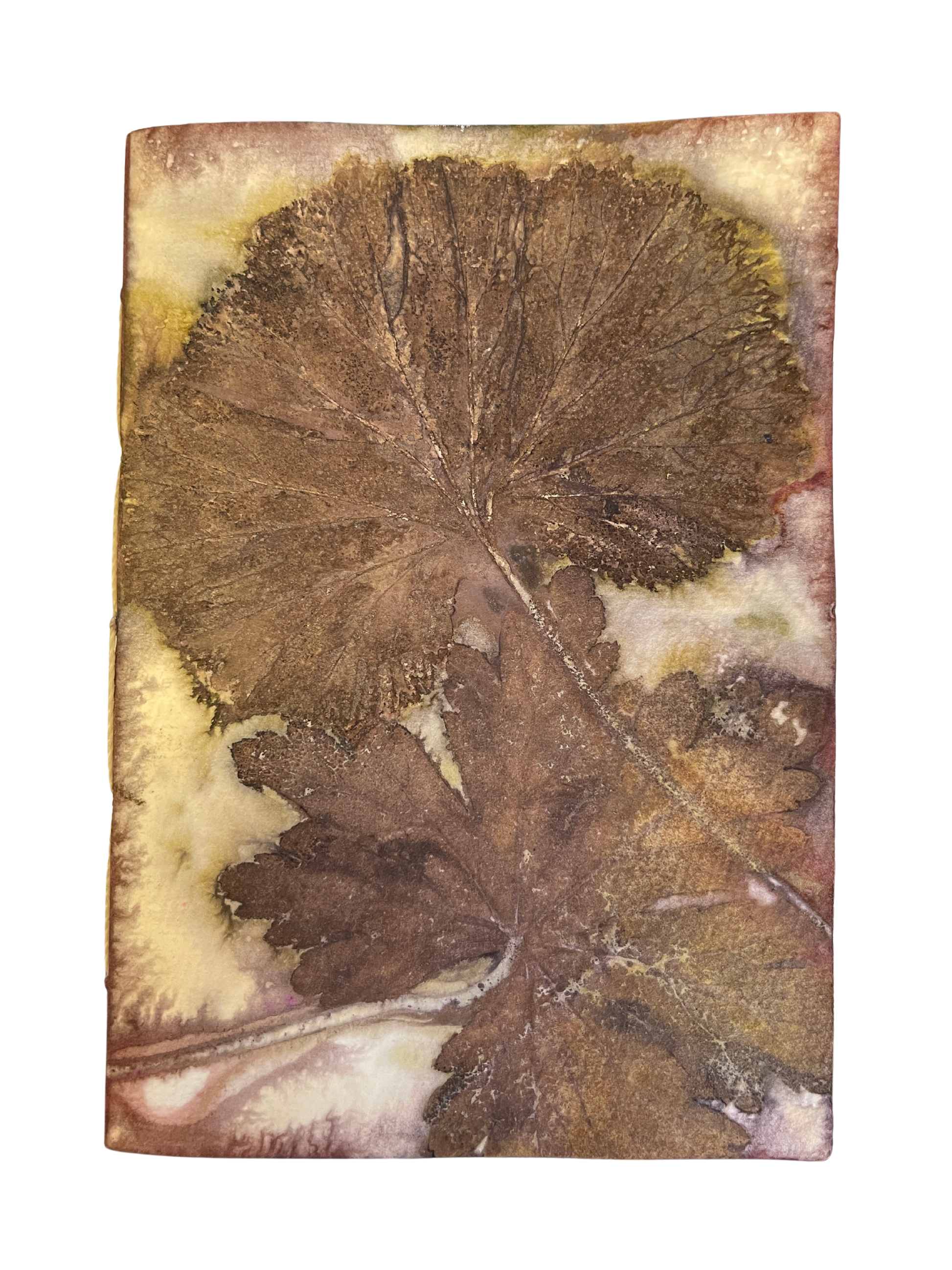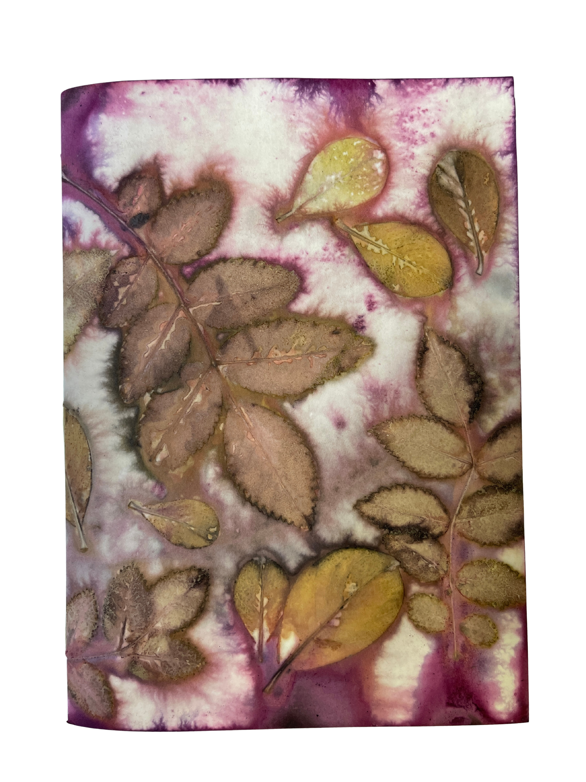 Ecoprints are created from natural pigments of botanicals (leaves, flowers, stems). The imprint is developed by creating tight "bundles" of layered material (fiber or paper) rolled with foliage specially prepared with natural mordants (alum, iron). The bundles are then simmered for a few hours in a natural dye bath. The combination of heat and mordants allows the botanicals to transfer the dyes contained in the plants to become "fixed" onto the material. The bundle is then unrolled revealing an impression when botanicals are removed from the material. Once dried, no enhancements are necessary.