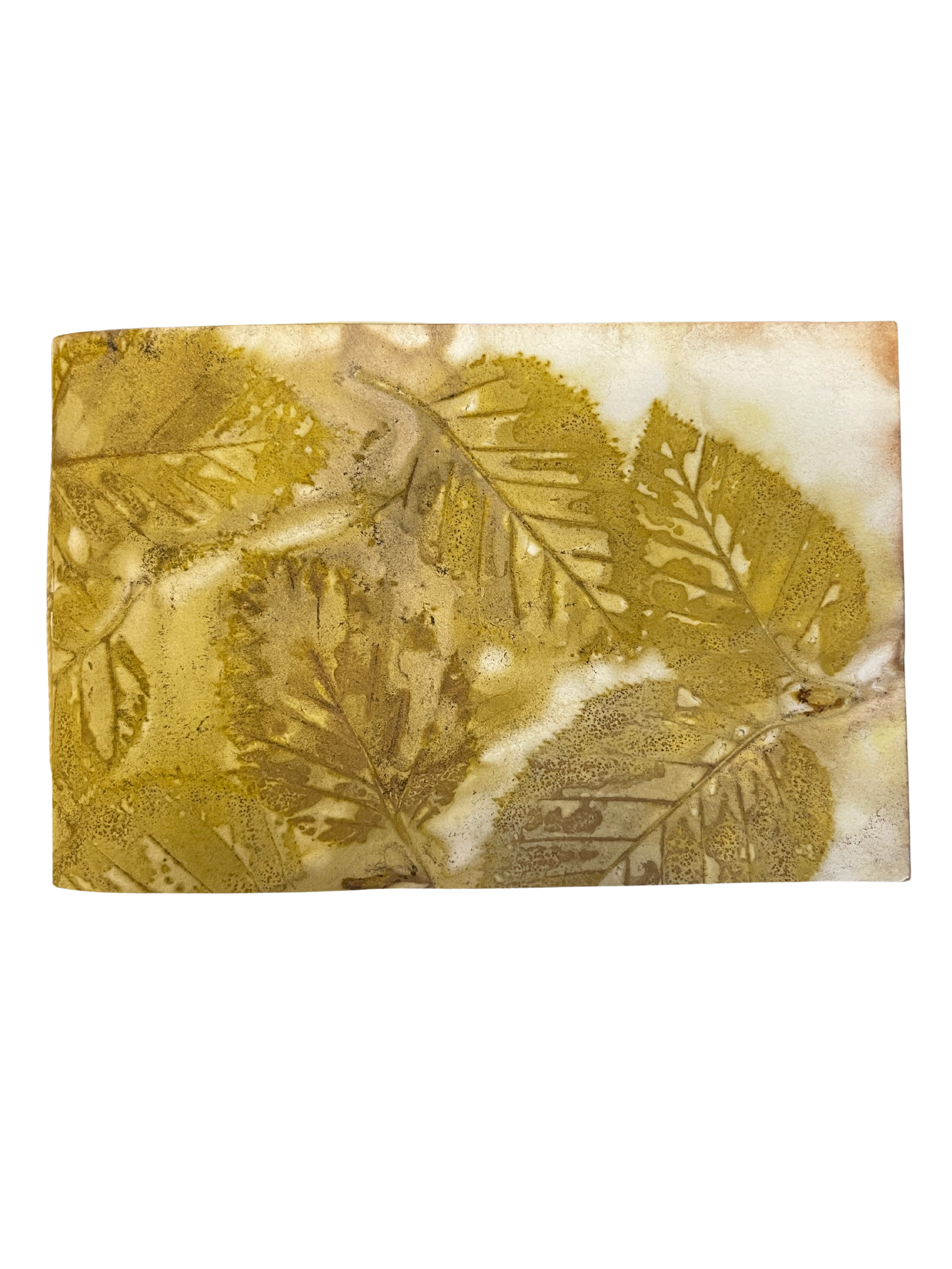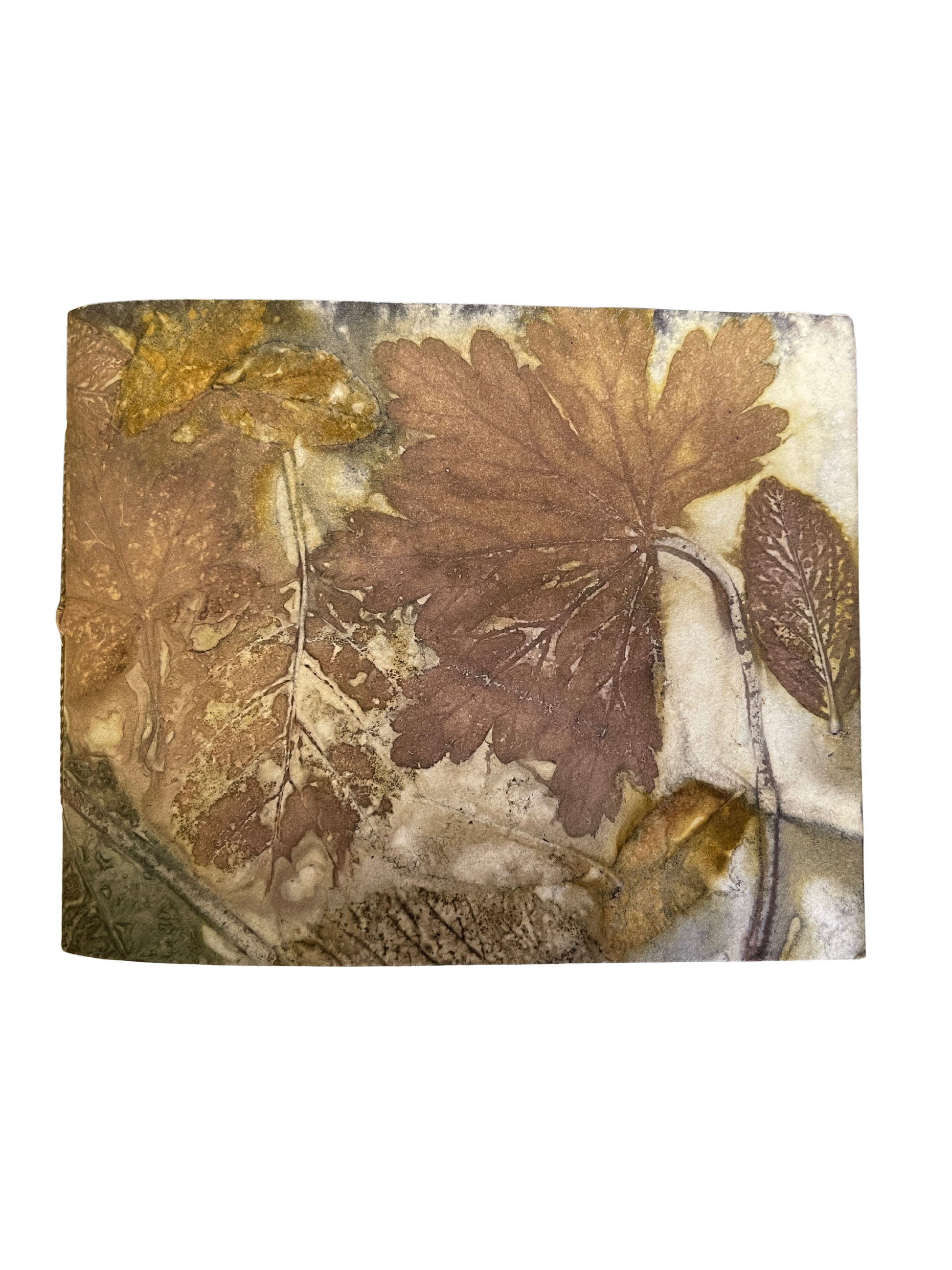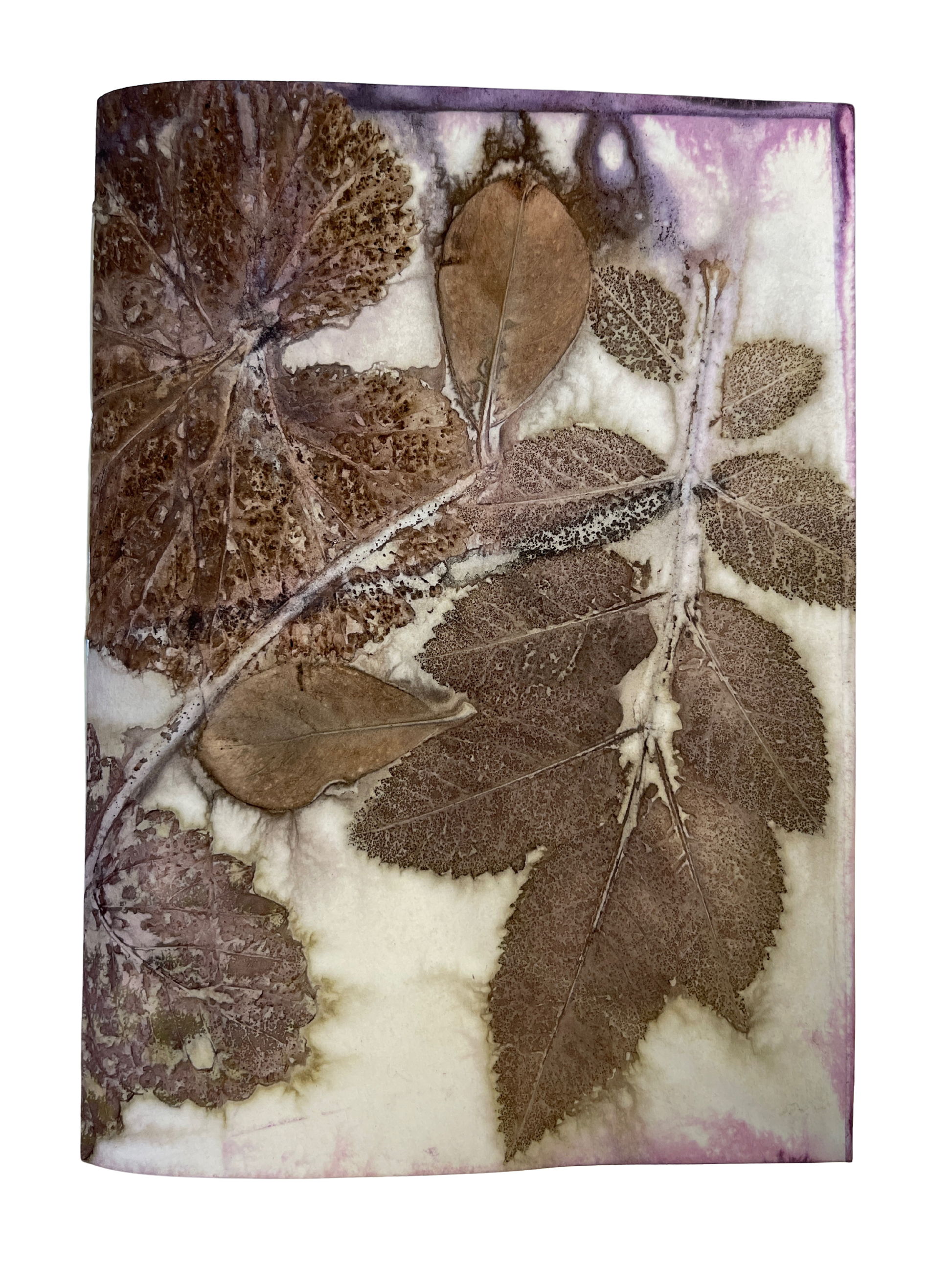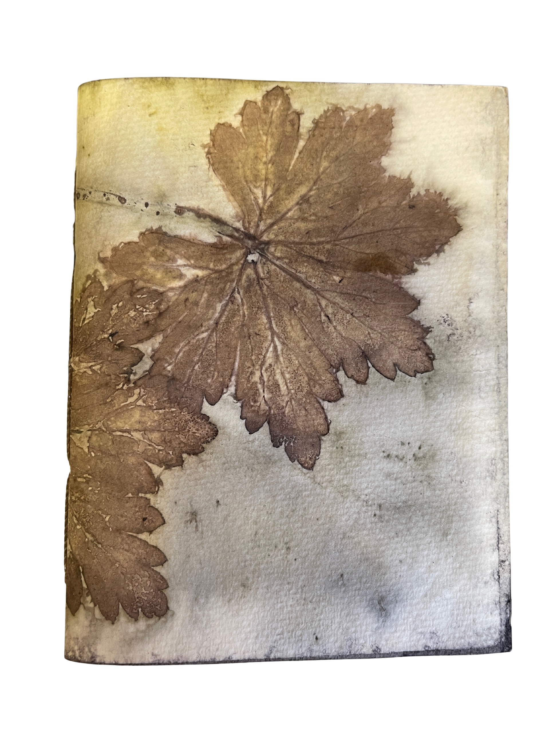 Ecoprints are created from natural pigments of botanicals (leaves, flowers, stems). The imprint is developed by creating tight "bundles" of layered material (fiber or paper) rolled with foliage specially prepared with natural mordants (alum, iron). The bundles are then simmered for a few hours in a natural dye bath. The combination of heat and mordants allows the botanicals to transfer the dyes contained in the plants to become "fixed" onto the material. The bundle is then unrolled revealing an impression when botanicals are removed from the material. Once dried, no enhancements are necessary.