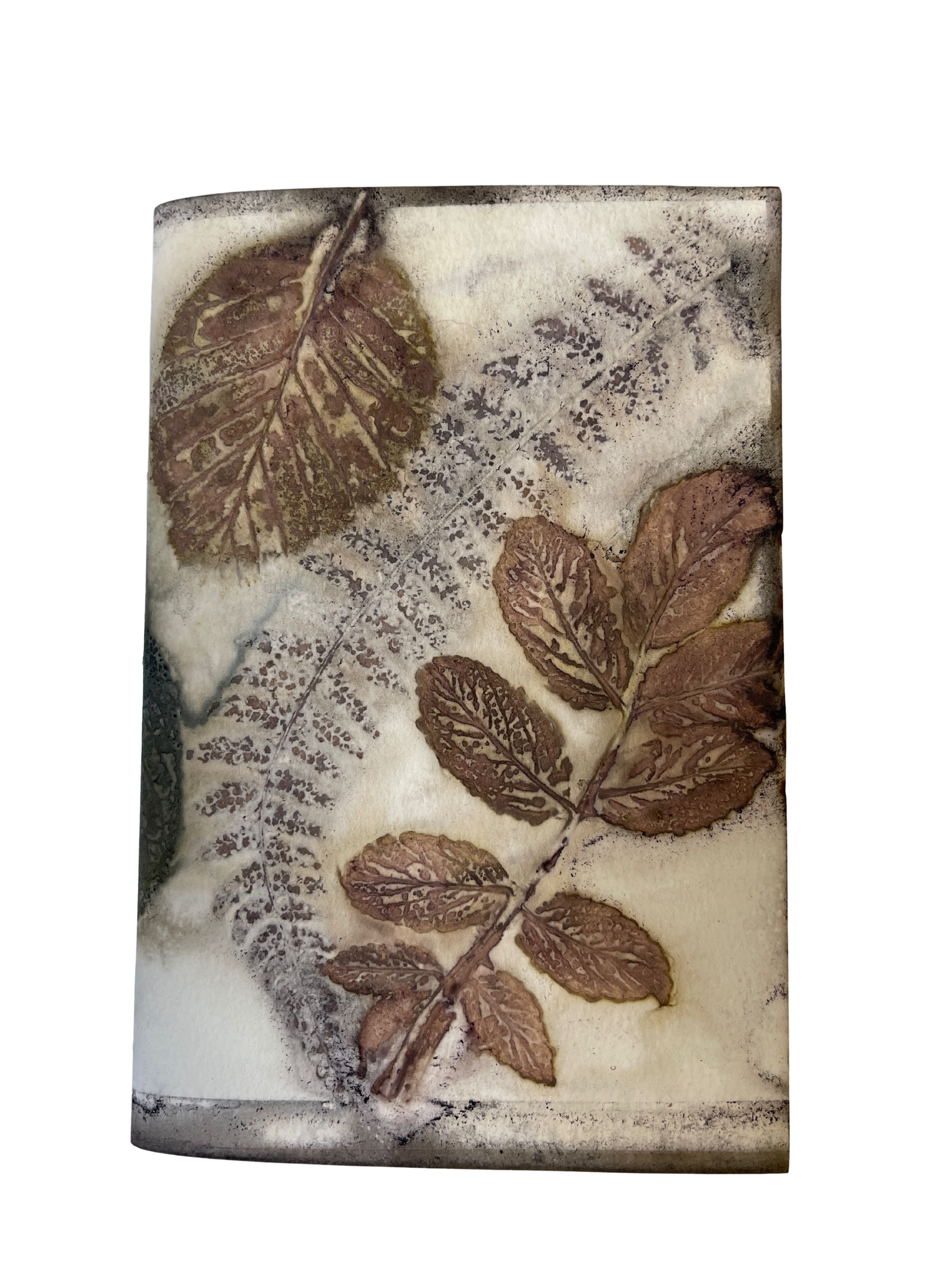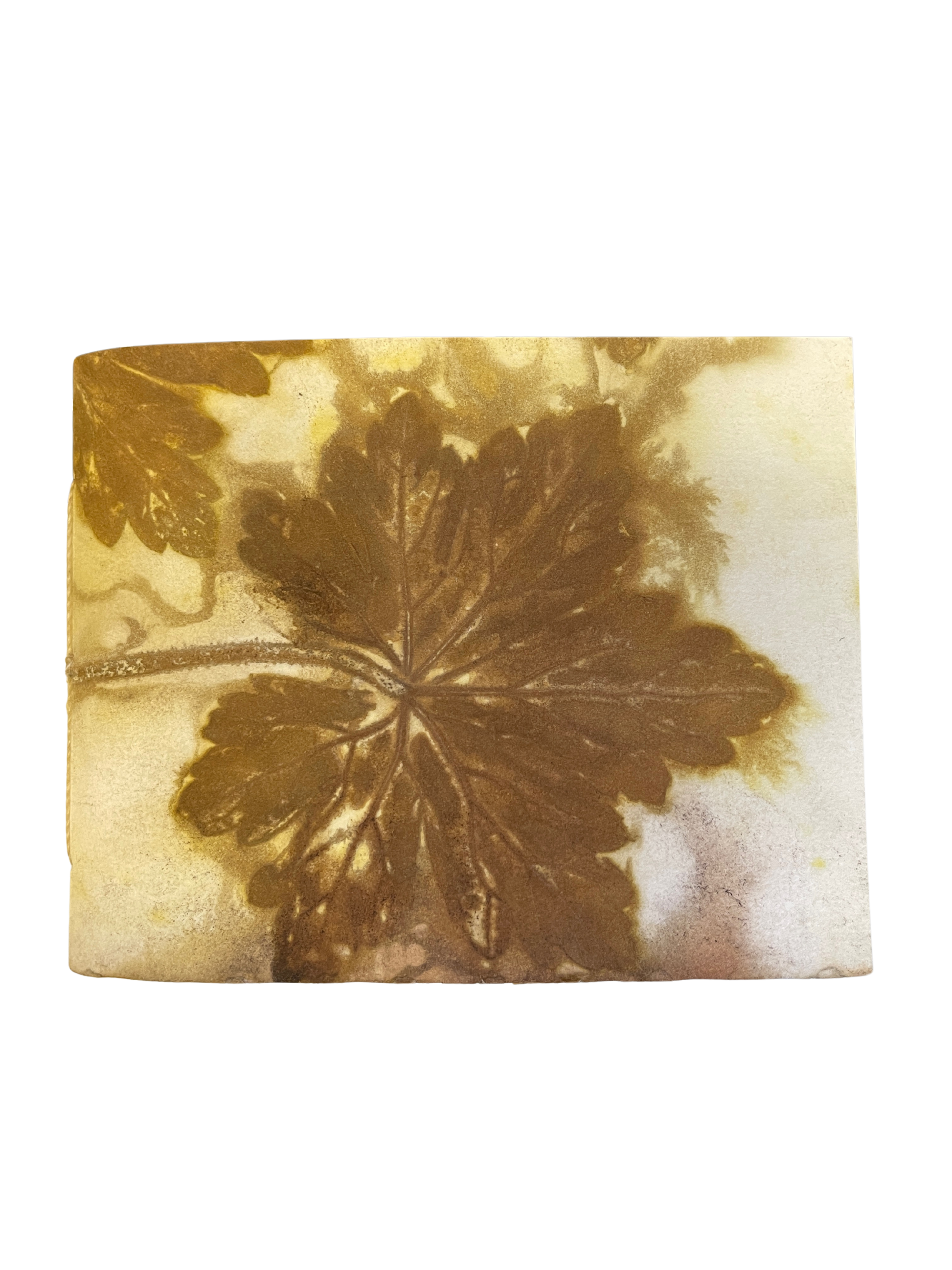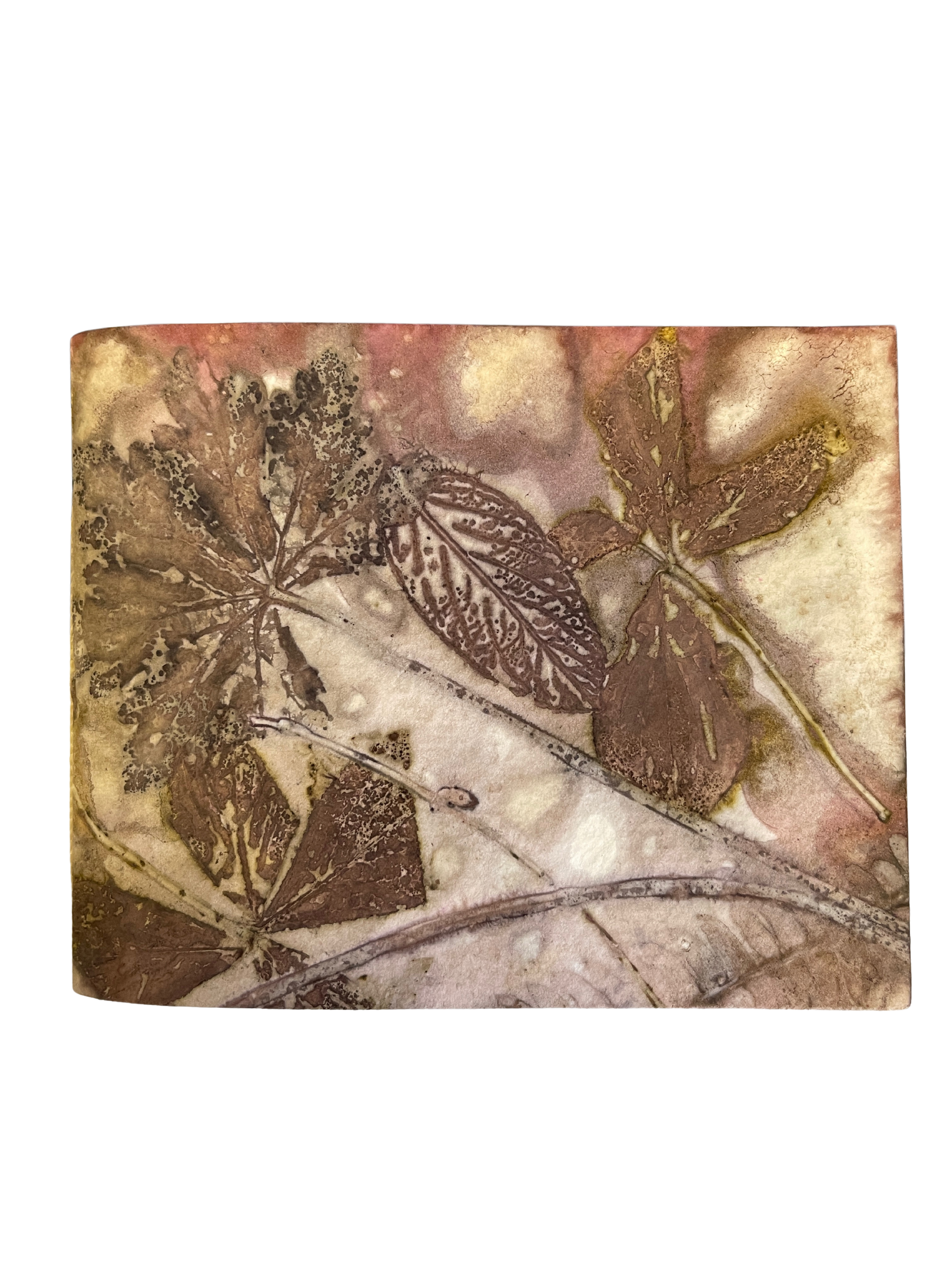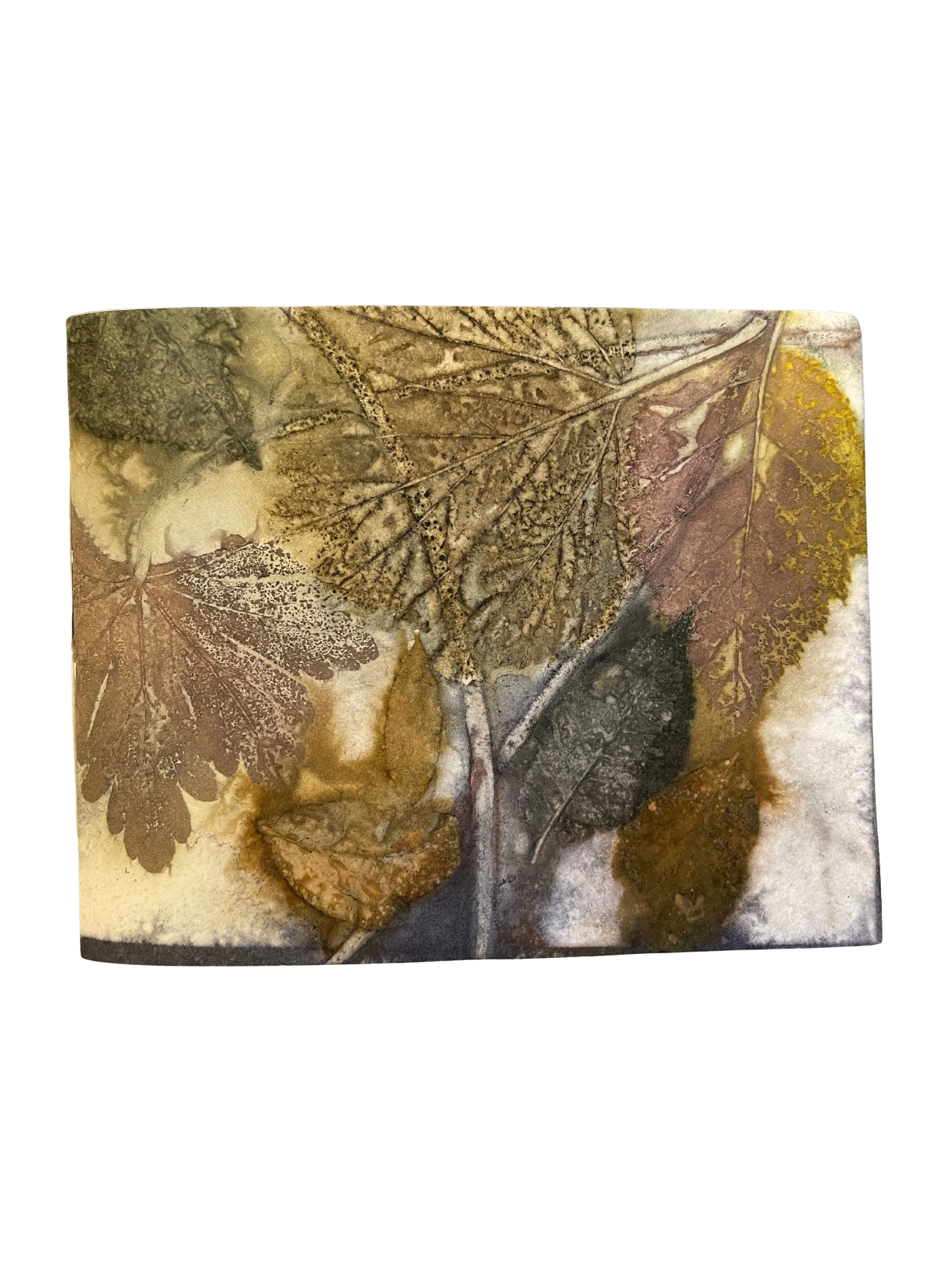 Ecoprints are created from natural pigments of botanicals (leaves, flowers, stems). The imprint is developed by creating tight "bundles" of layered material (fiber or paper) rolled with foliage specially prepared with natural mordants (alum, iron). The bundles are then simmered for a few hours in a natural dye bath. The combination of heat and mordants allows the botanicals to transfer the dyes contained in the plants to become "fixed" onto the material. The bundle is then unrolled revealing an impression when botanicals are removed from the material. Once dried, no enhancements are necessary.