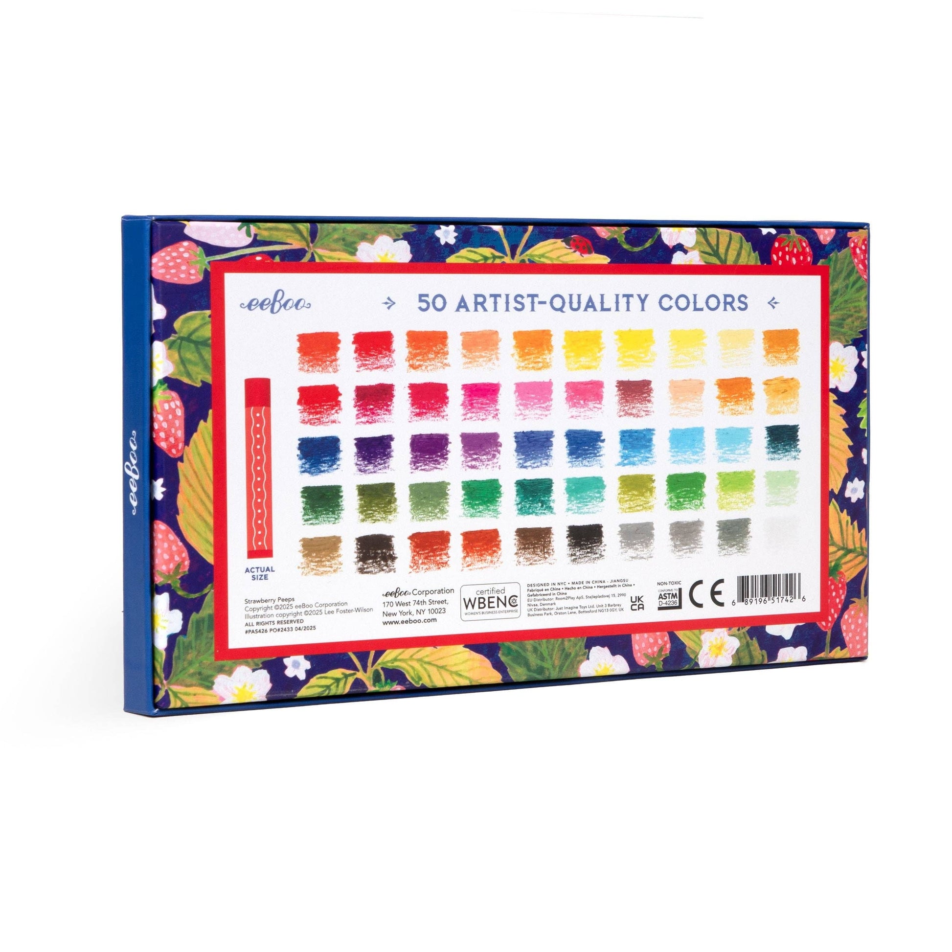 Artist-quality oil pastel sticks in a brilliant array of 50 fade-resistant, long-lasting colors. Packaged in a sturdy, two-piece box decorated with vibrant birds and strawberries by artist Lee Foster-Wilson. These pastels have a soft-touch feel and easy to blend, giving depth and subtlety to artwork on paper, canvas, or board. Pairs perfectly with the Seaside Peeps Hardcover Artist Sketchbook.