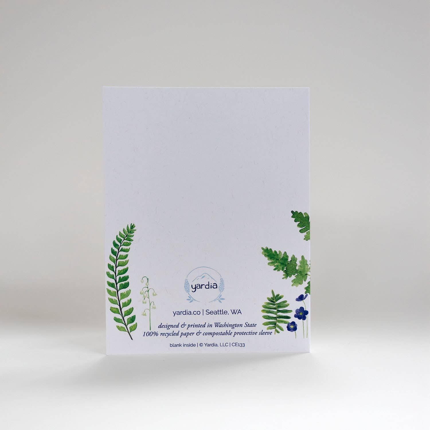 Help your customers send the empathy that's difficult to express with this botanical sympathy card. Woodland ferns and violets painted in watercolor accompany a hand lettered message that reads: "When someone we love is gone, we miss their presence and are so grateful to have known them." Measures 4.25" x 5.5". A2 Size. 100% recycled paper (card and envelope). Made in USA (Washington state) with Forest Stewardship Council certified sustainable printing. Folded card, blank inside. Kraft envelope. Protected by commercially compostable clear sleeve.