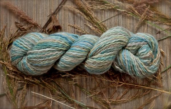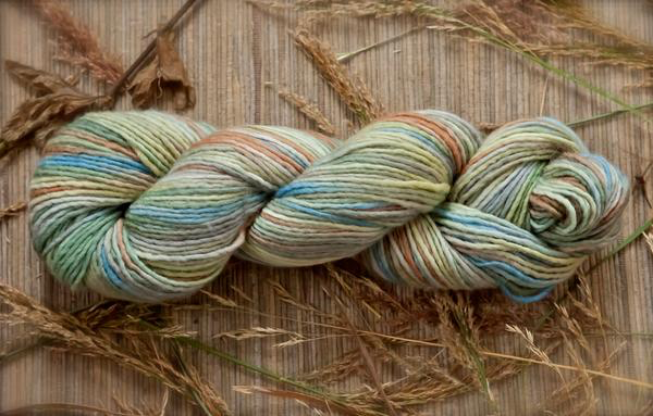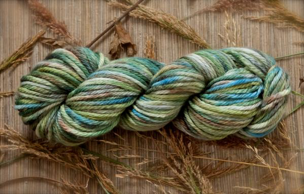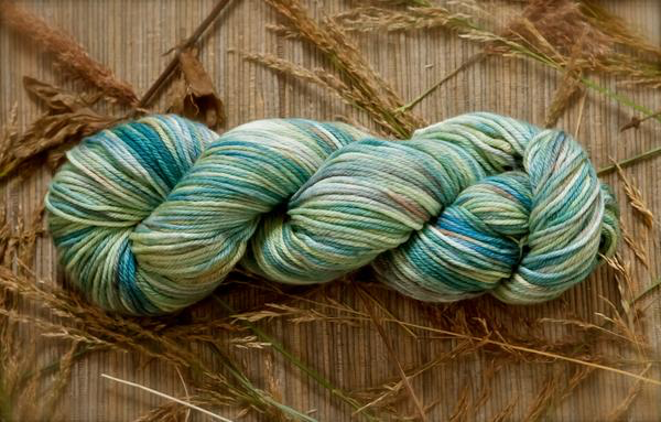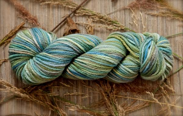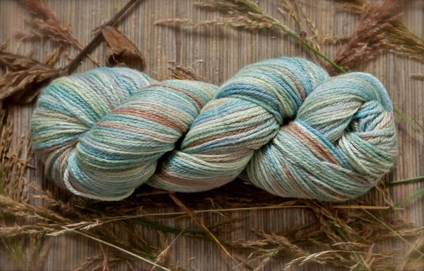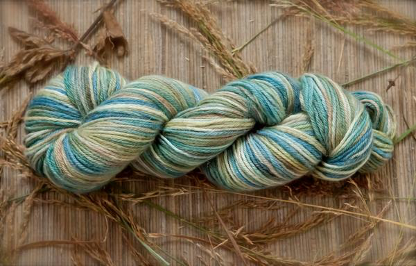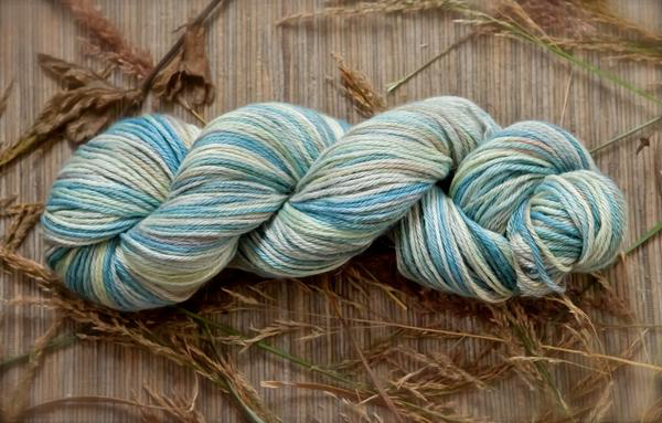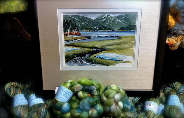 Inspired by Susan Ogle's delightful watercolor "Three Mile Bay", depicting the view across Orca Inlet towards Hawkins Island, this yarn has the lovely array of teals, blues, aquas and greens as seen in early spring with its lingering snow and emerging new growth. Susan is a resident fine artist and co-owner of Orca Book and Sound, Cordova's own local bookstore. I love how this colorway knits up and creates a lovely watercolor wash in knit, crochet, and woven pieces, as well as in handspun yarn in the hand dyed fiber also available in this colorway.