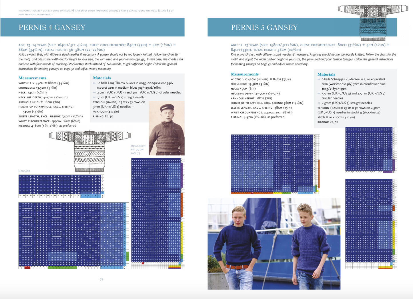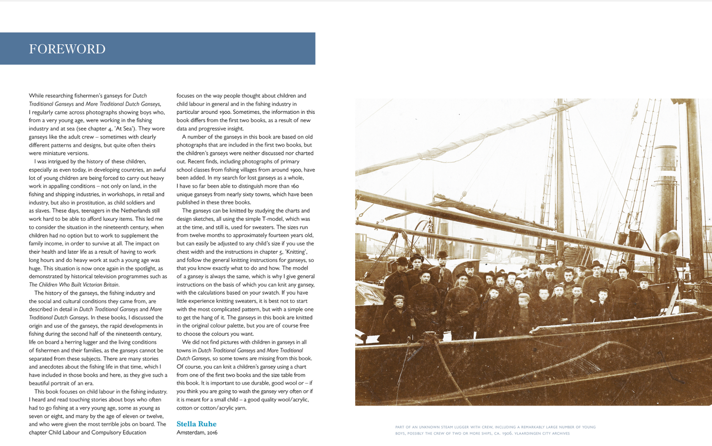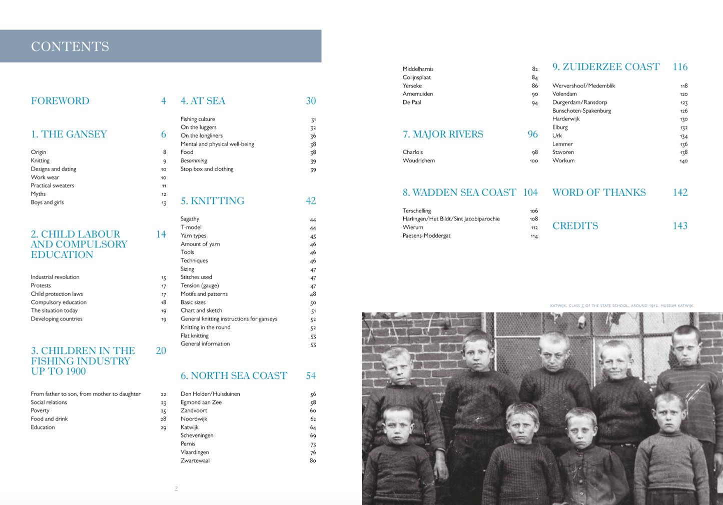 From around 1875 to 1950, Dutch fishermen wore sweaters with characteristic knit and purl stitch patterns, sometimes cable. These jerseys, known as ganseys, became an intrinsic part of the identity of the Dutchmen who wore them. Many of the children in these fishing families wore ganseys too, and numerous photos have been discovered in recent years of schoolchildren dressed in the knitwear seen on their fishermen fathers.