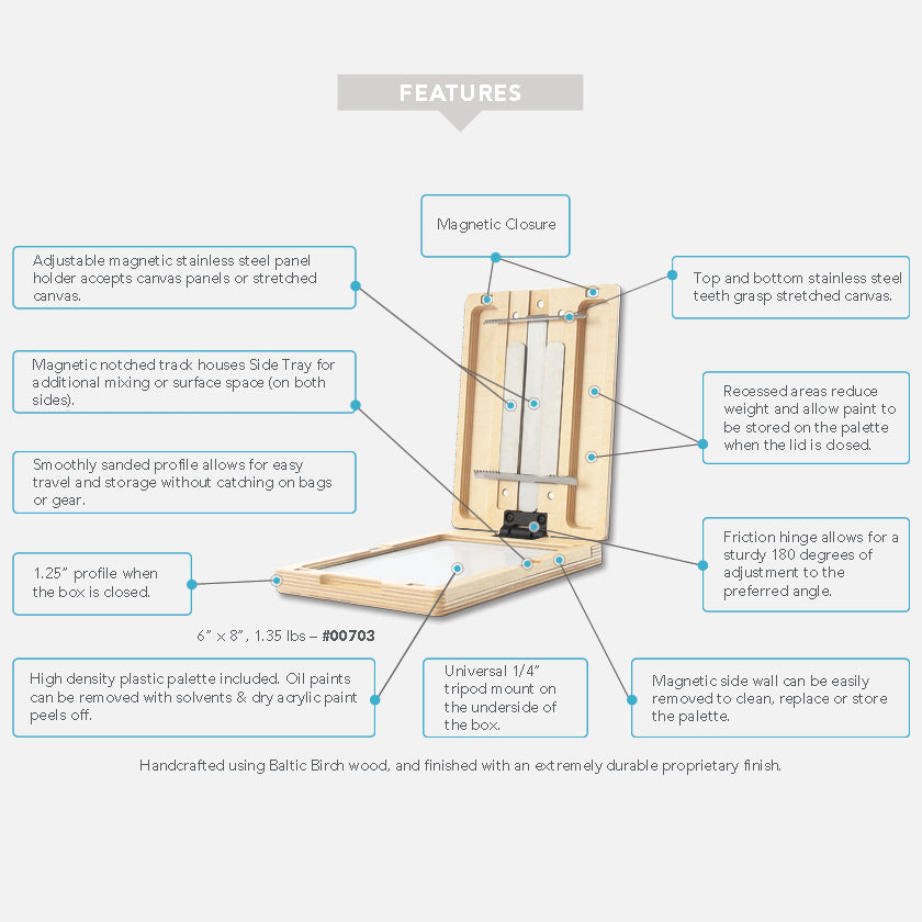 Magnetic Components: Strong rare earth magnets are used for the closure, panel/canvas holder, removable side wall for palette cleaning/replacement, and accessory side tray attachment.