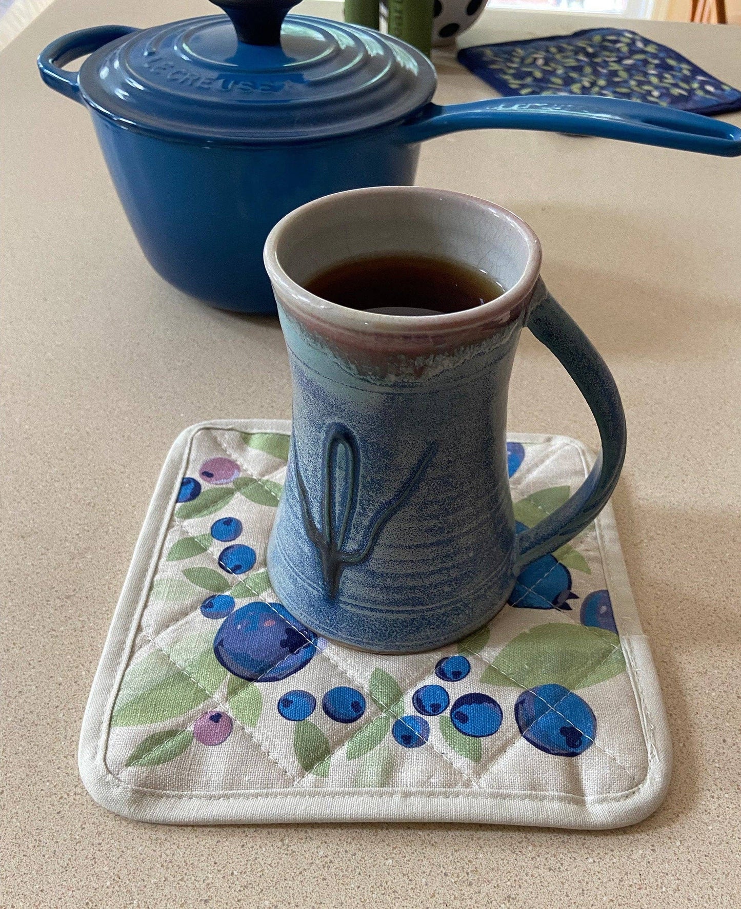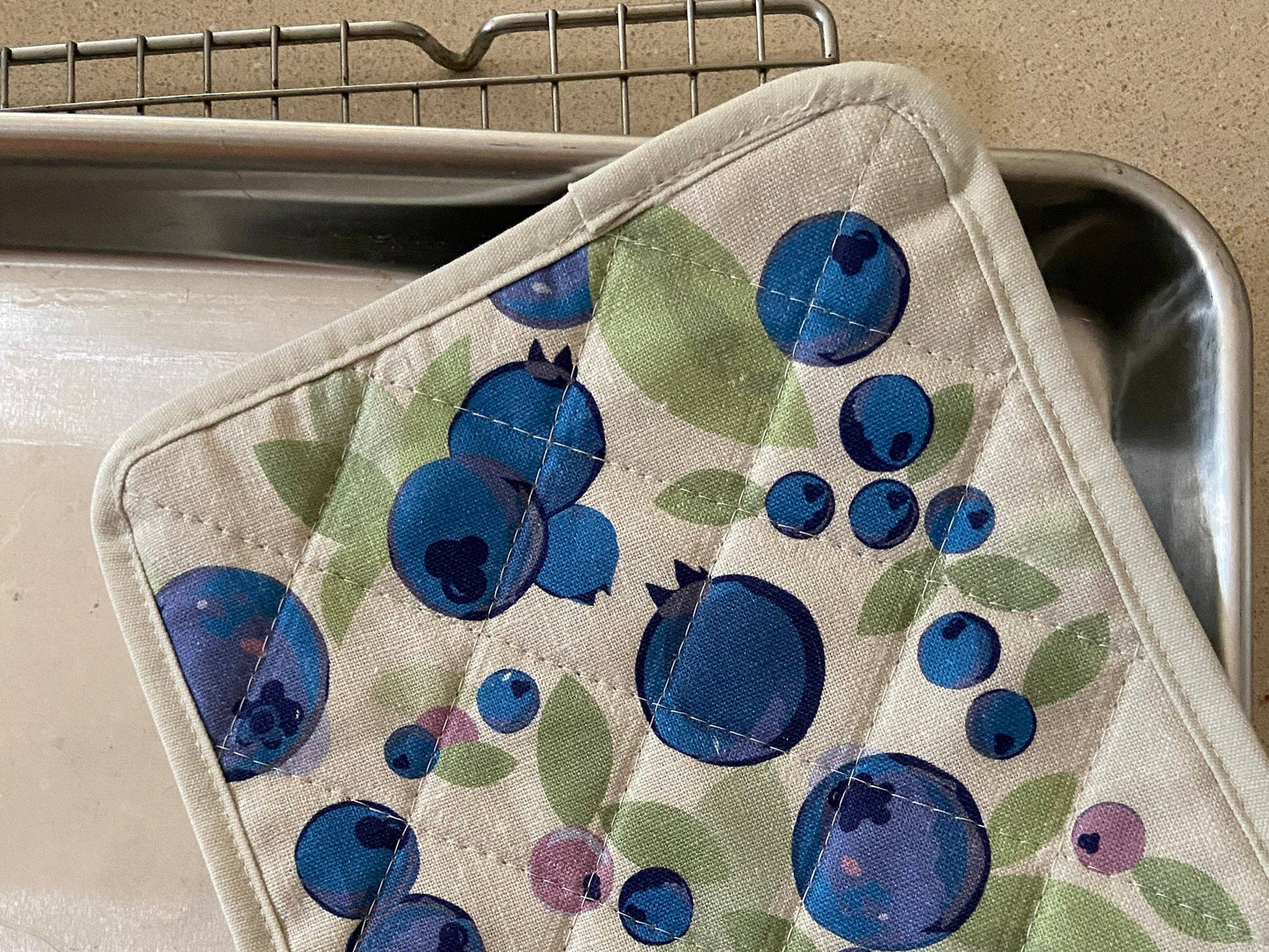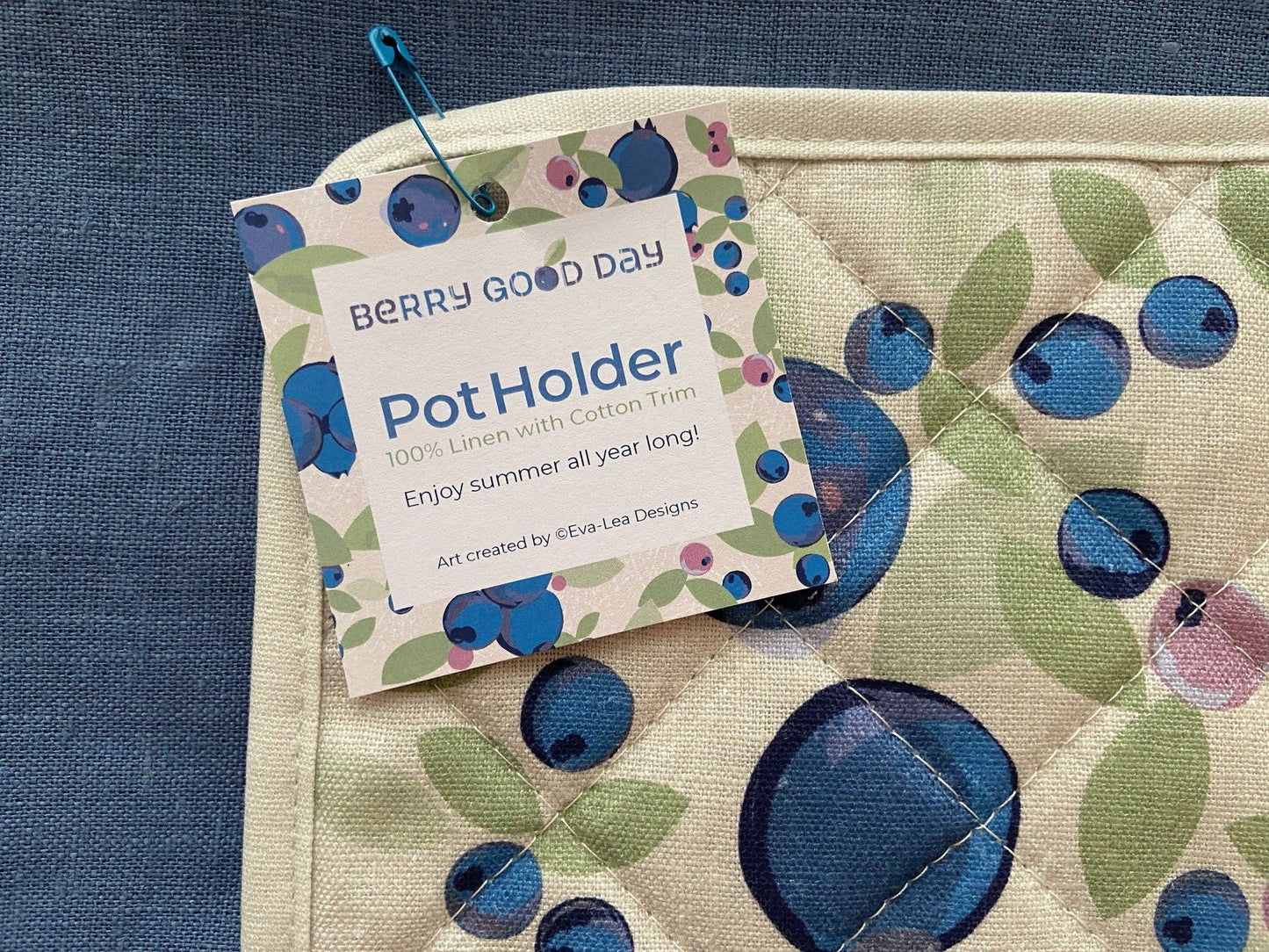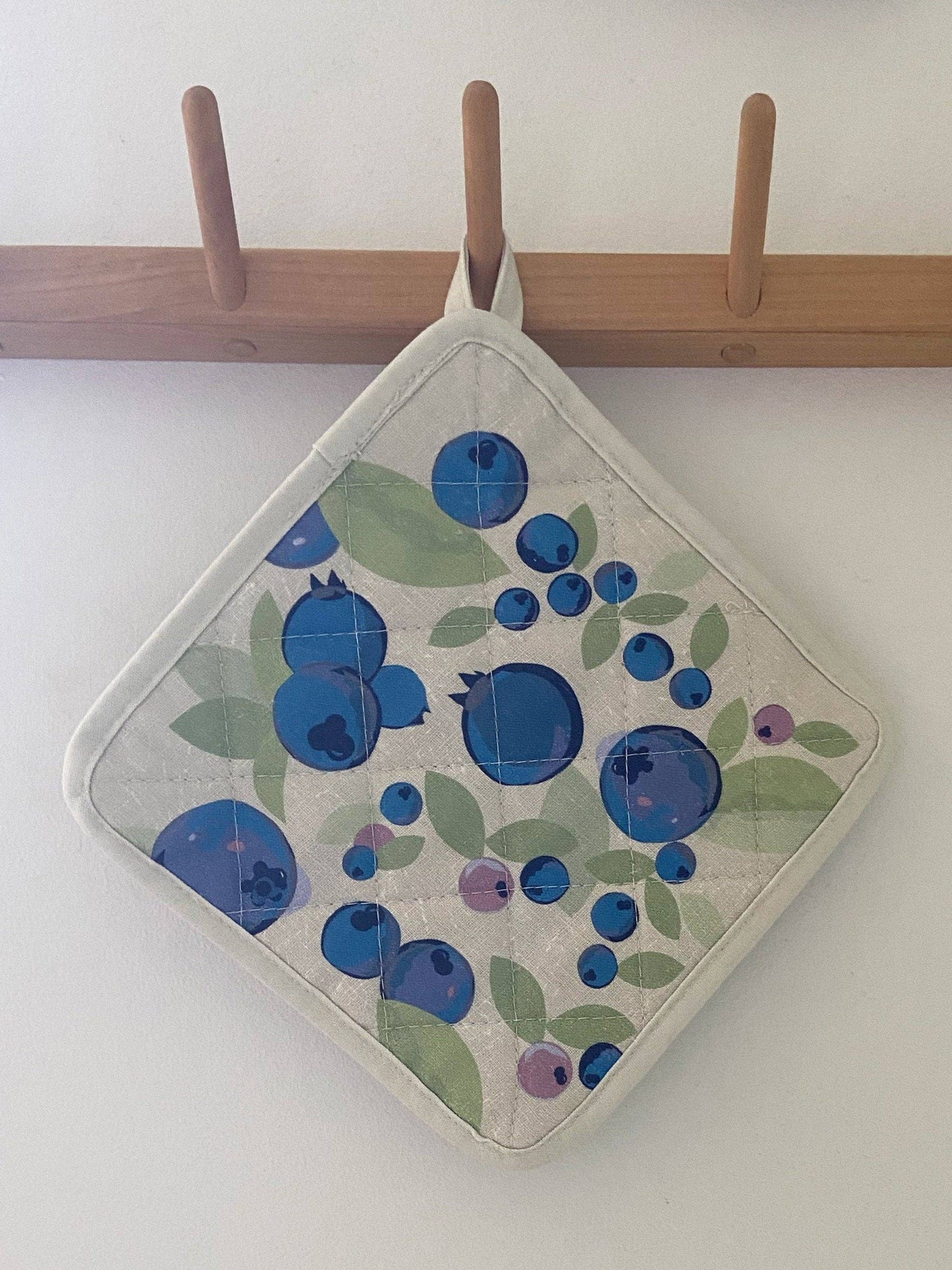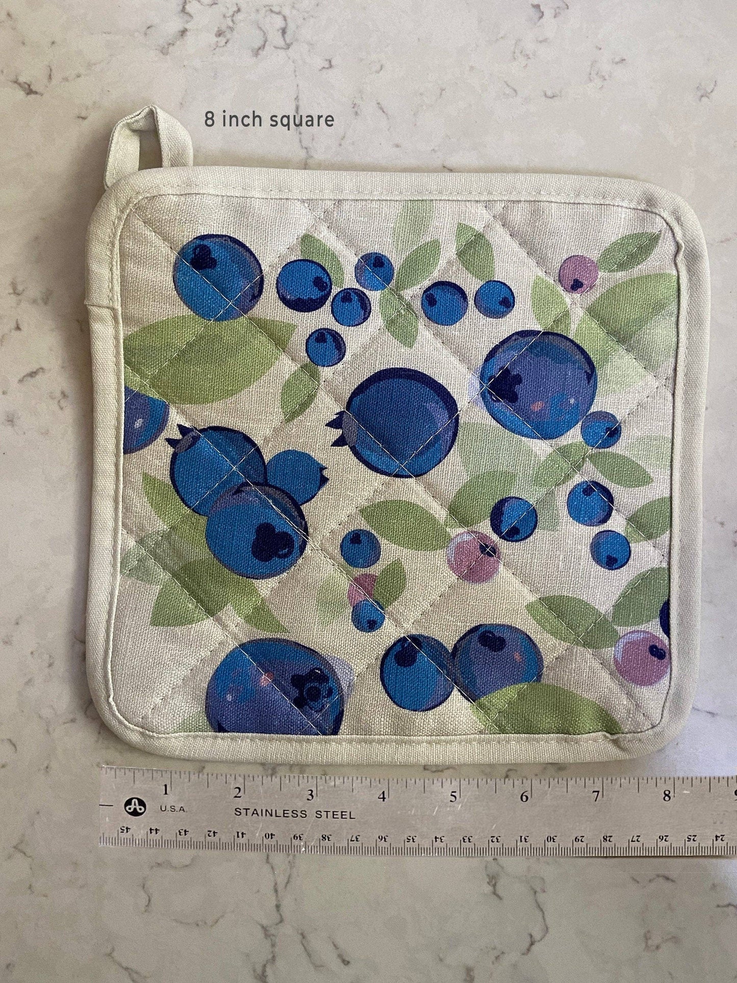 Enjoy the sweetness of summer blueberries all year long! This 100% linen pot holder with sturdy cotton trim is covered in big bold blueberries. Bring back memories of summer all year long. It’s both useful and unique! The sturdy, lint-free fabric softens with each wash but the colors stay rich and vibrant. Add some fun functional art to your home, cottage, or cabin decor.