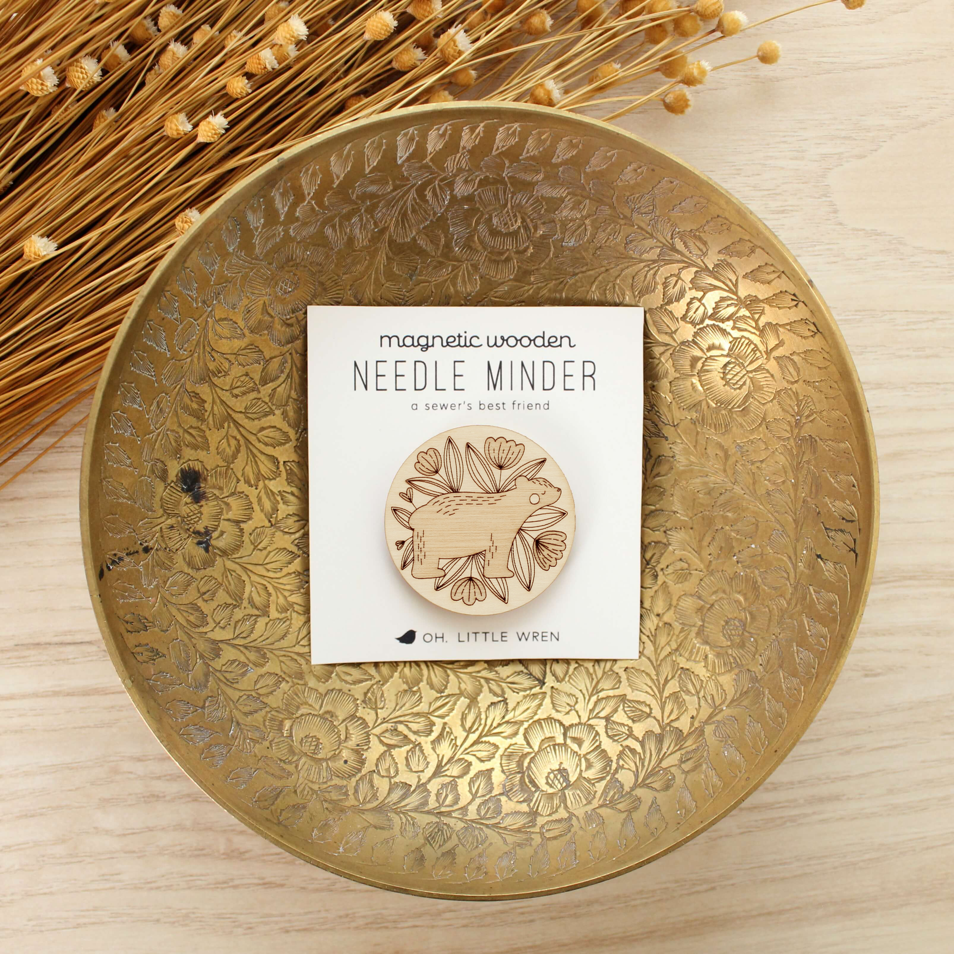 birch wood needle minders are a sewer's best friend. always keep track of your needle with this handy minder. its two magnet system allows you to magnetically stick your sewing needle to the front of the minder and use the second magnet to secure it to your sewing project--look mom, no holes! handy and beautiful--the perfect gifting combination. our needle minders come mounted to a paper backing and are secured in a plastic hanging sleeve for retail display.